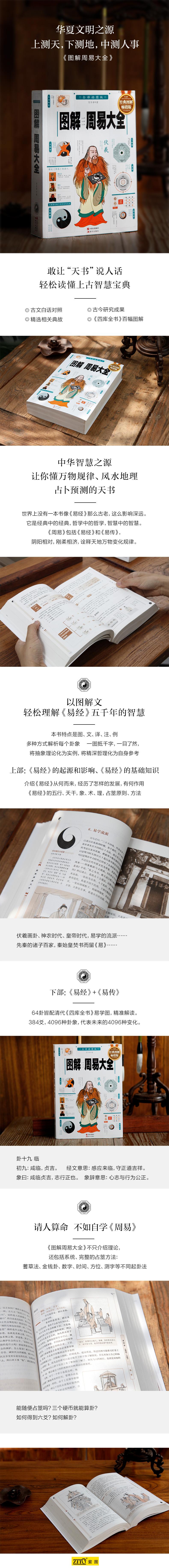 《图解周易大全(2014全译插图版)》由贺华章著:独一无二的学术奇观:《周易》被誉为华夏文明之源。它的古老和深邃使它当之无愧为“经典中的经典,哲学中的哲学,智慧中的智慧”。在中国古代目前,易学专著达三千余种,形成人类文化目前独一无二的学术奇观。教授们的评价:冯友兰教授说:“《周易》是宇宙代数学。”被誉为“中国脊梁”的梁漱溟教授说:“《周易》是中华民族的文化瑰宝。”张岱年教授说:“《周易》是中华民族传统文化的优选典籍。”《易经》不再是“天书”:本书综合了古代众多的易学知识,结合今人的近期新研究成果,详细介绍了《易经》的起源、成书过程、发展历程等。翻开本书,《易经》不再是“天书”。