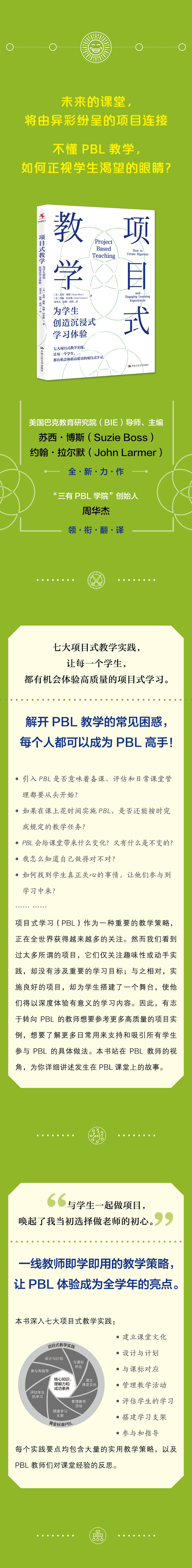 项目式学习(PBL)作为一种重要的教学策略,正在全世界获得越来越多的关注。然而我们看到过太多所谓的项目,它们仅关注趣味性或动手实践,却没有涉及重要的学习目标;与之相对,实施良好的项目,却为学生搭建了一个舞台,使他们得以深度体验有意义的学习内容。因此,有志于转向 PBL 的教师想要参考更多高质量的项目实例,想要了解更多日常用来支持和吸引所有学生参与 PBL 的具体做法。