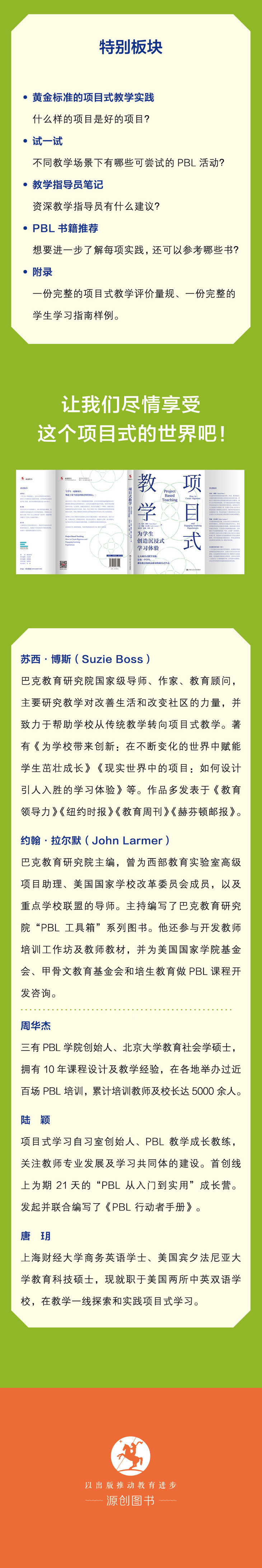 本书还包括一些特别板块,用来加深你对项目式教学实践的理解。另提供具体的教学策略,以帮助 PBL 在你的学生群体中落地。