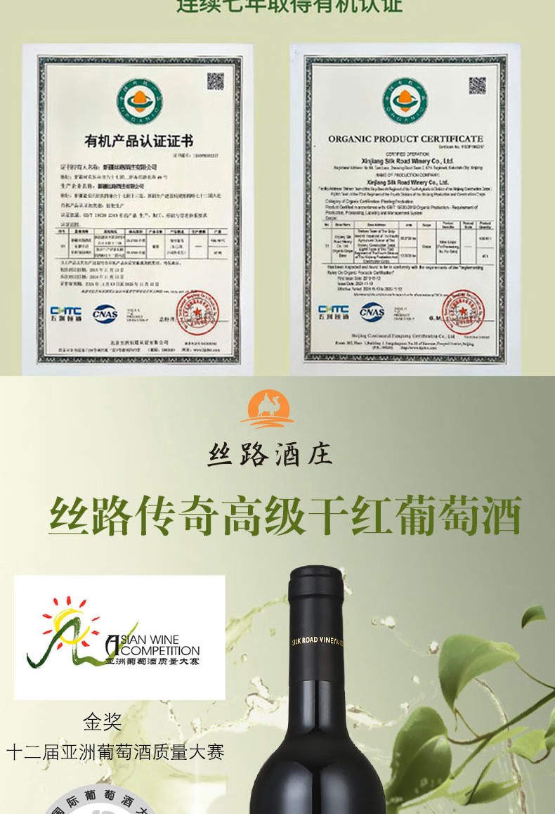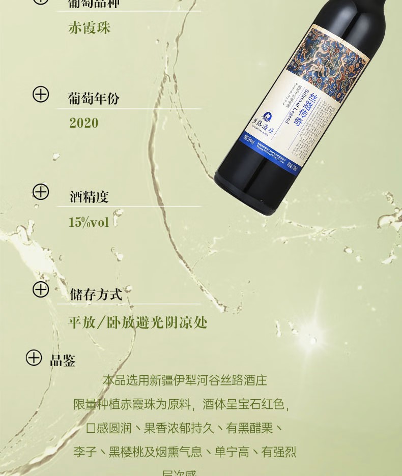 丝路酒庄15度传奇高级赤霞珠干红葡萄酒新疆伊犁750mL整箱礼盒 2020年 单支750ml*1