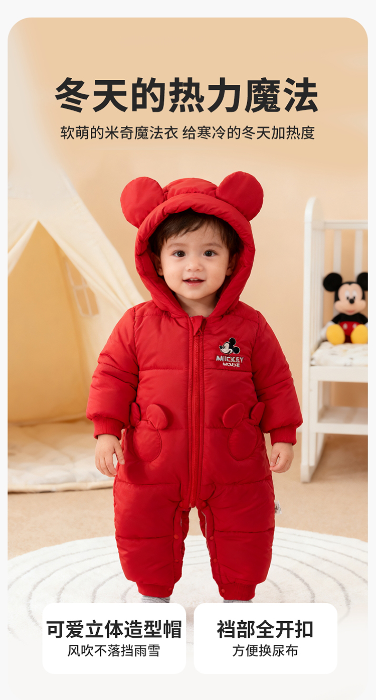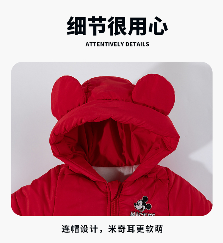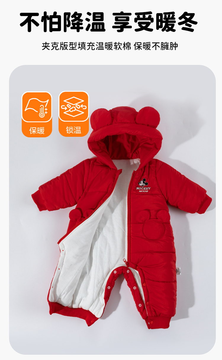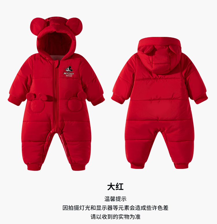 【米奇立体帽子哈衣】秋冬新款男女宝宝夹棉保暖连体衣大红爬爬服ZD4EL019