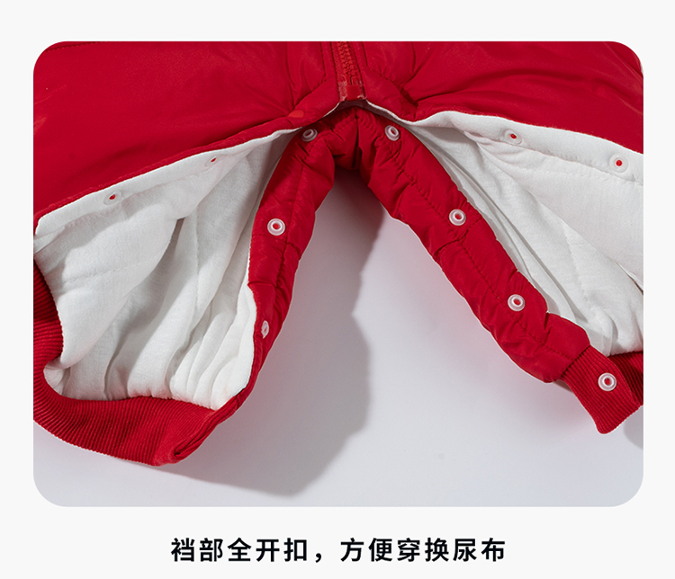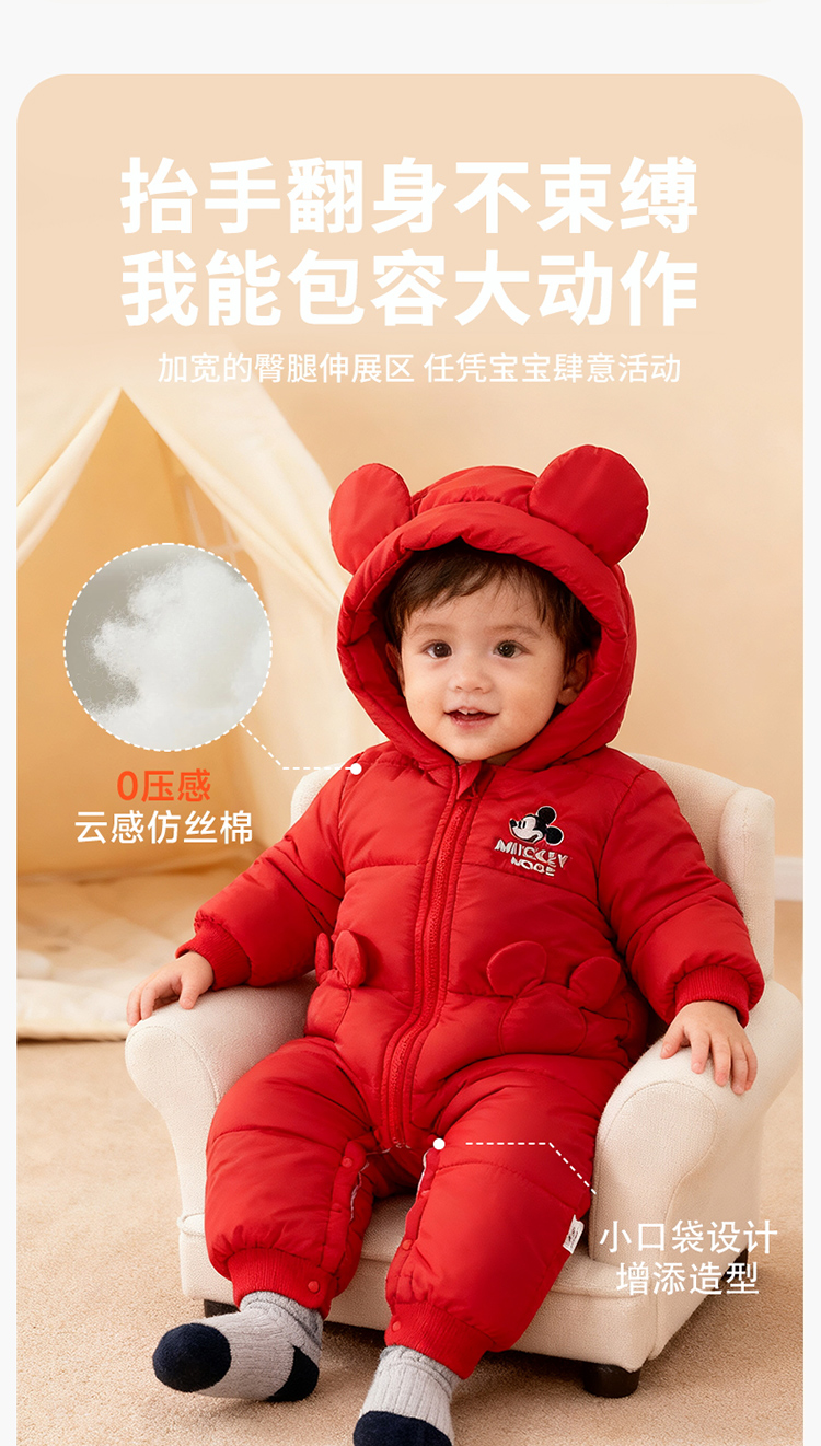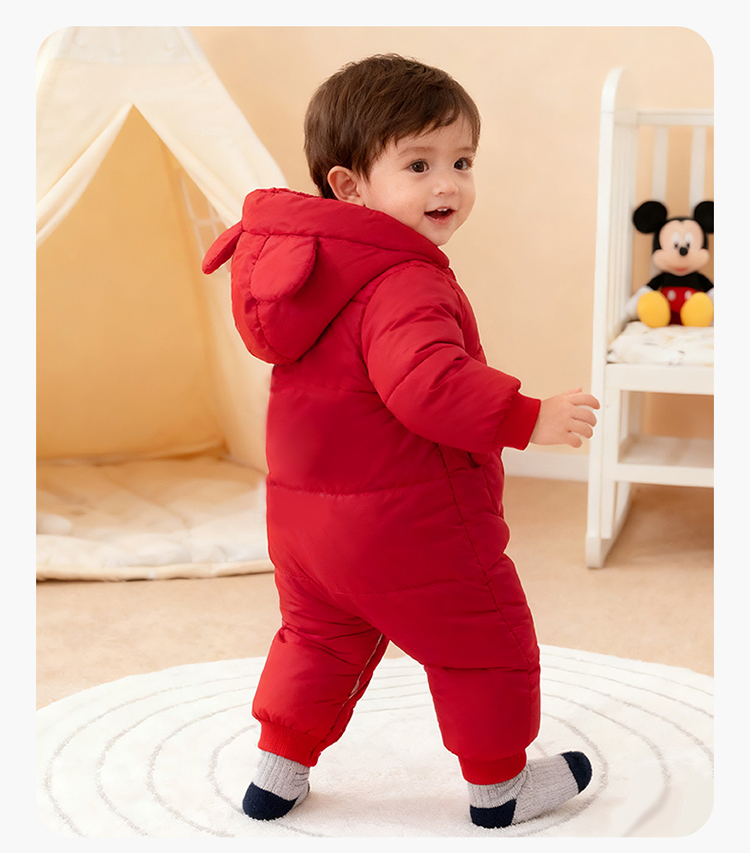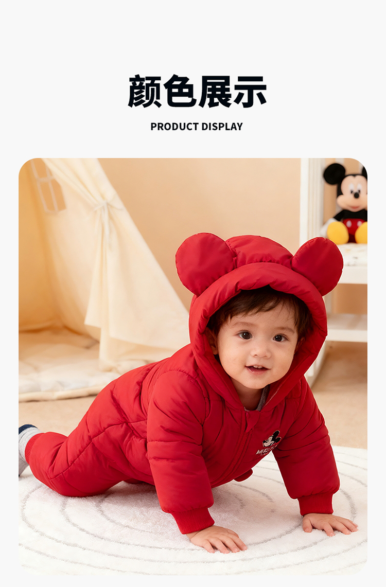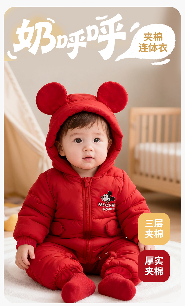 【米奇立体帽子哈衣】秋冬新款男女宝宝夹棉保暖连体衣大红爬爬服ZD4EL019