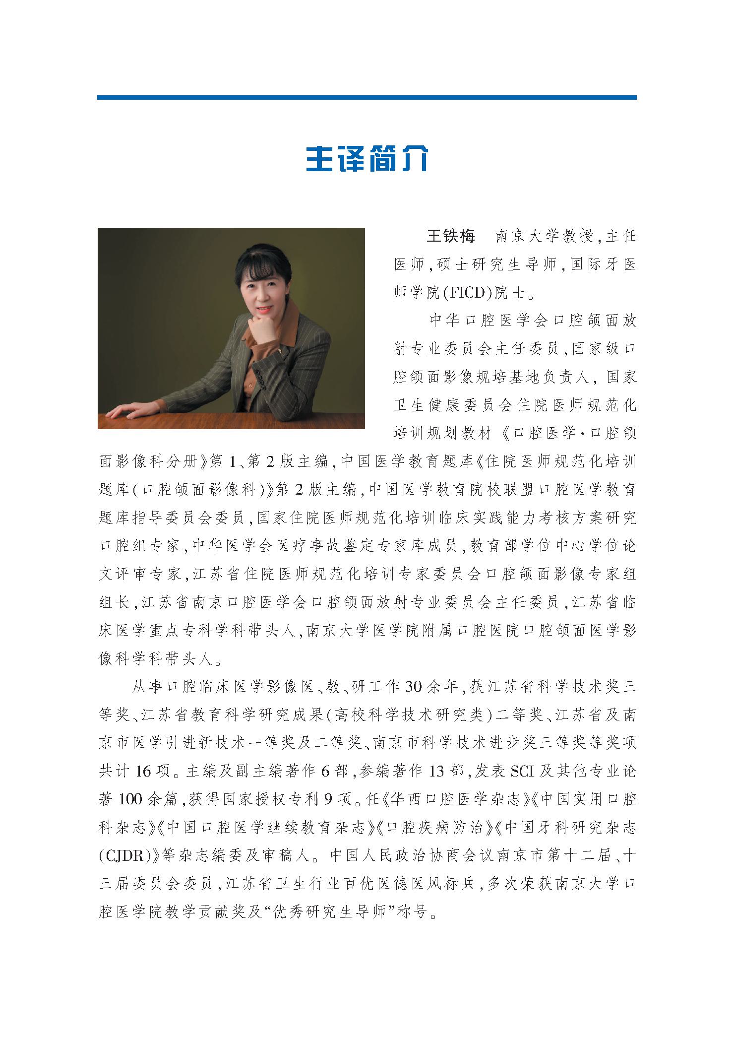 帕克扎提·色依提 南京大学口腔医学硕士,乌鲁木齐市口腔医院医师。中华口腔医学会第七届口腔颌面放射专业委员会工作秘书,中国医学教育题库《住院医师规范化培训题库(口腔颌面影像科)》第2版主编秘书,中国医学论坛报·今日口腔“口腔影像读图训练营”线上特邀讲师(2020—2024年),分别荣获南京大学第三届教师教学竞赛特等奖、南京大学医学院优秀教师、南京大学口腔医学院优秀教师。从事口腔临床医学影像医、教、研工作5年余。参译专业著作2部,参编中文著作1部。发表科研论文10篇,其中SCI论文5篇。获批实用新型专利3项。