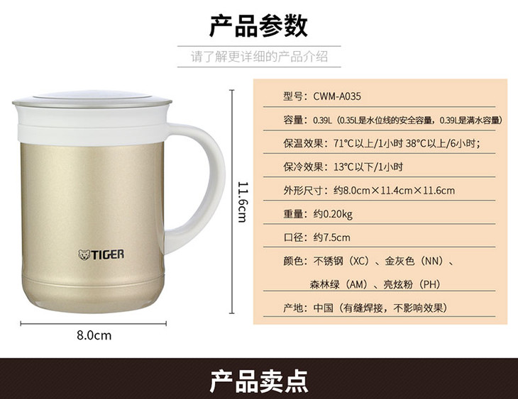 【6F】 tiger虎牌 保温杯CWM-A035茶滤网办公室泡茶水杯350ML