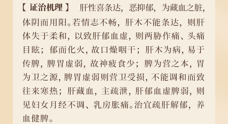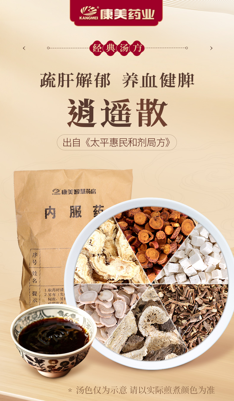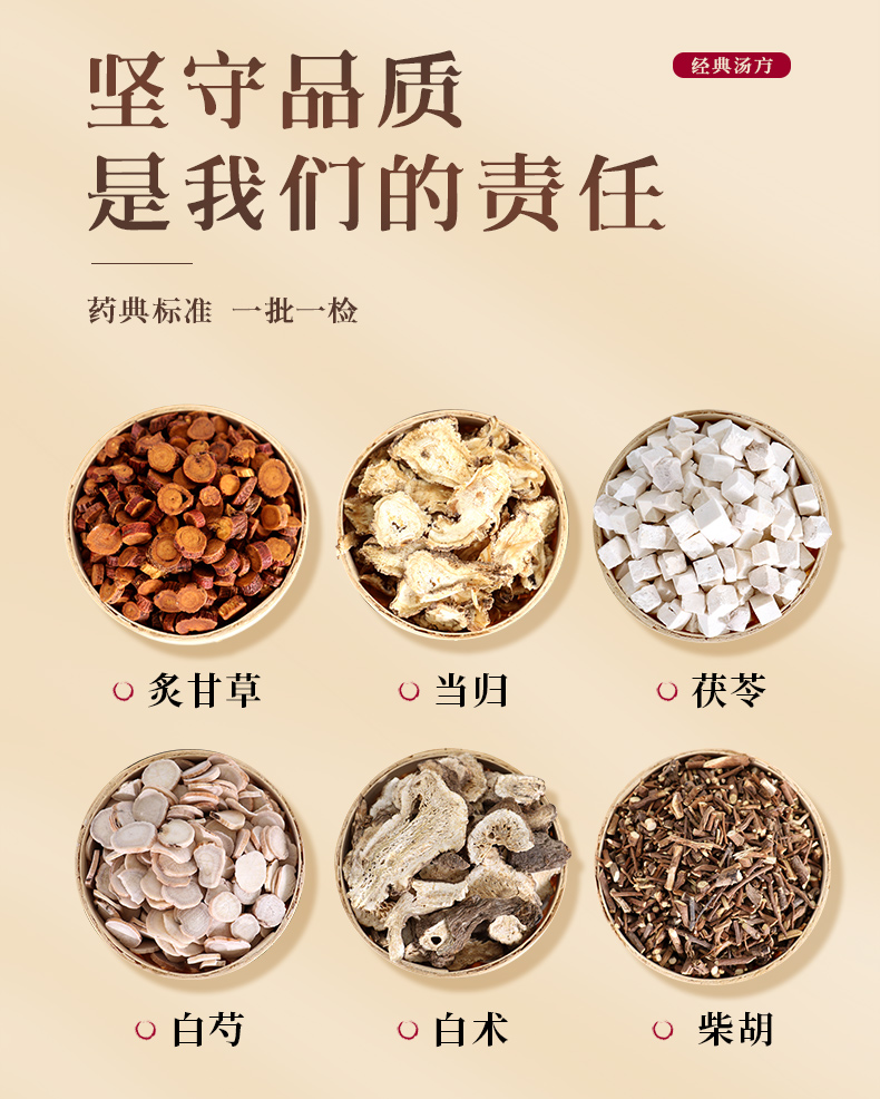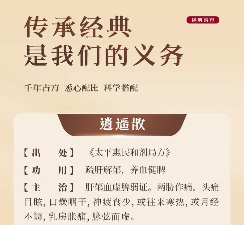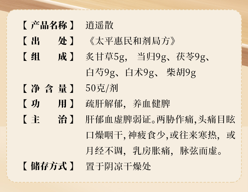逍遥散50g/剂 (炙甘草/当归/茯苓/白芍/白术/北柴胡)出自《太平惠民和剂局方》