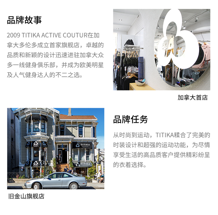 - 2009年,Titika Active Couture诞生于北美时尚之都,重新定义运动服饰,让运动时尚,前卫、性感,更宣扬一种无畏自由的生活态度。TITIKA缇缇卡不断求变,为品牌添加多种元素