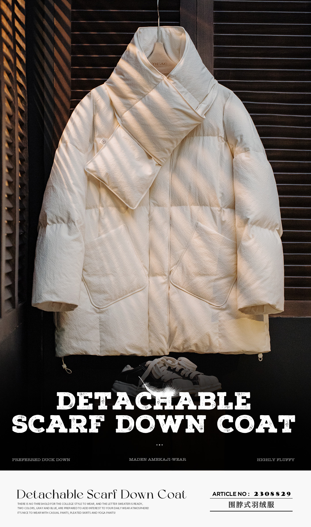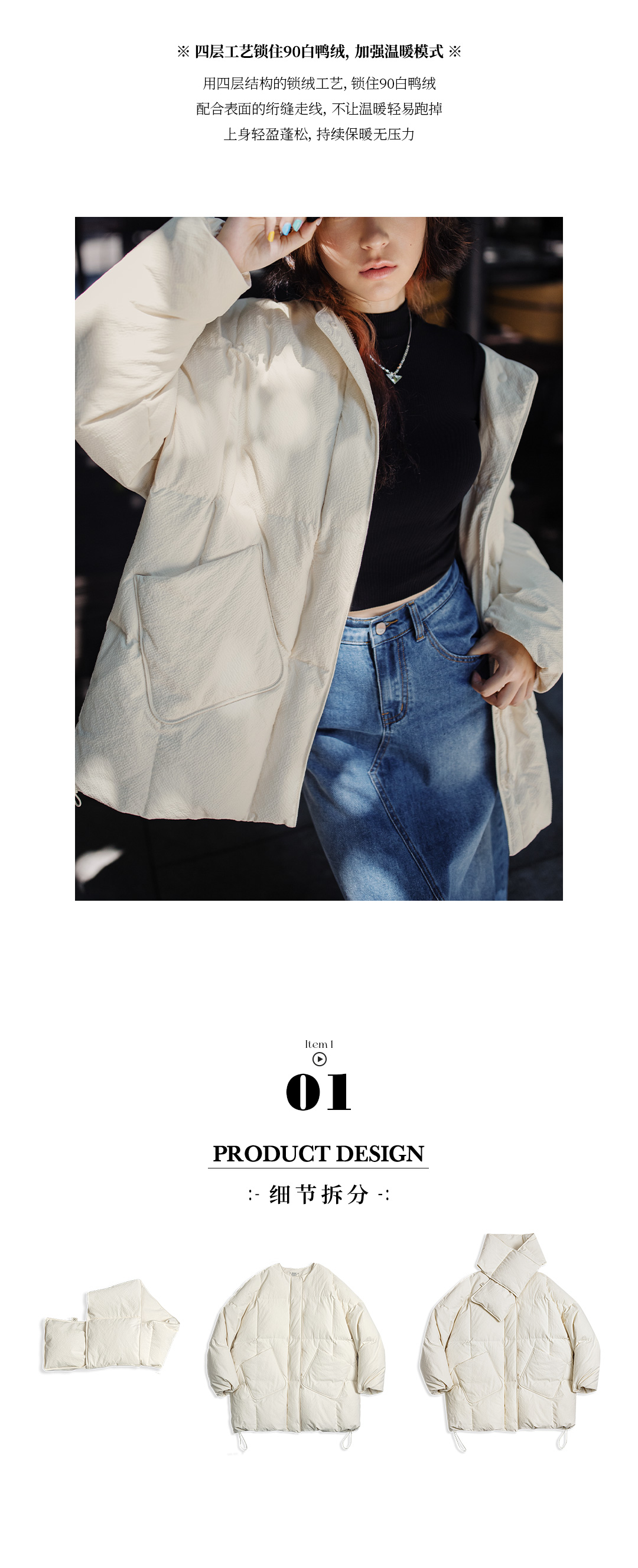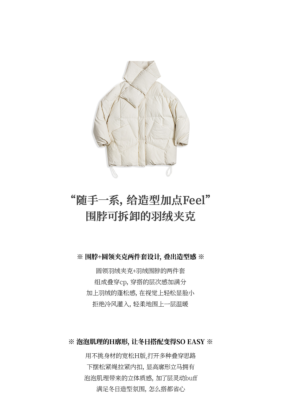 马登女装美式90白鸭绒羽绒服轻薄可拆卸围脖面包服保暖外套女冬