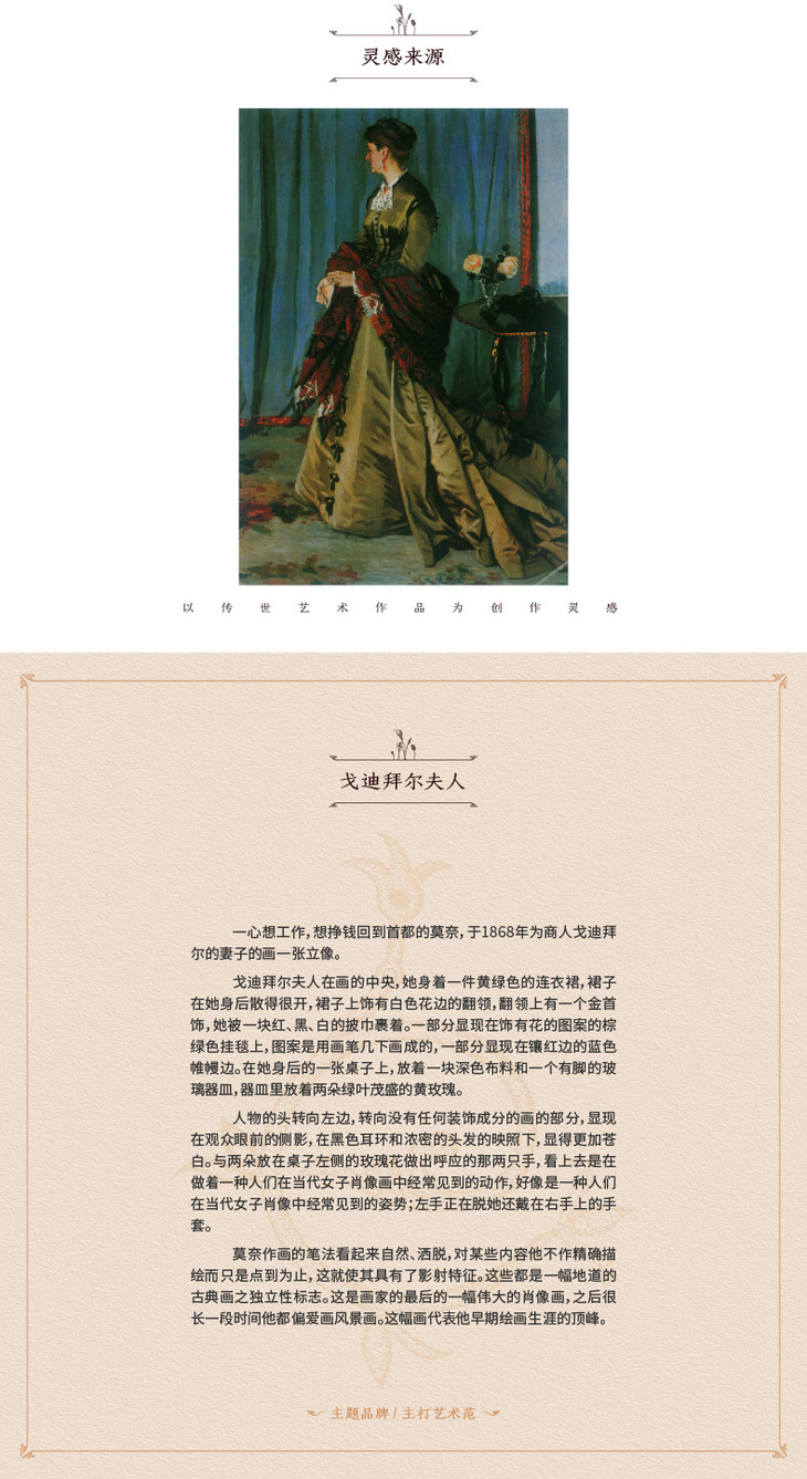 品牌风格:源自千年文学和万年艺术的时装,让你的气质内涵一枝独秀,精彩的品质,华丽的风格,炫耀的视觉,让你的衣品从此与众不同,标记你深厚的文化内涵与艺术气息。