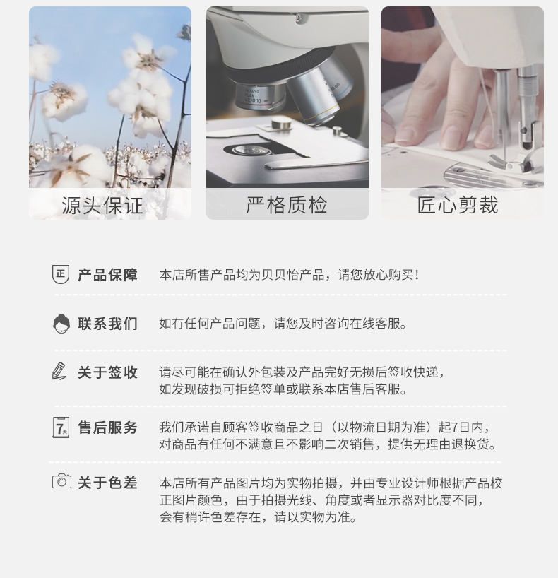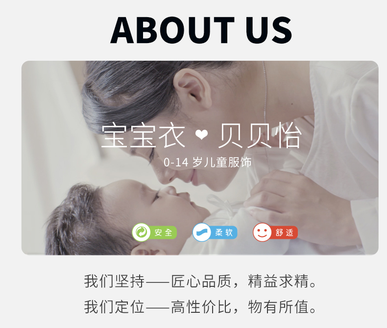 - 贝贝怡专注0-6岁婴幼儿服饰,坚持安全、柔软、舒适的产品理念,为千万中国家庭提供超高品质、安全可靠的婴幼儿服饰产品,妈妈放心,宝宝开心!