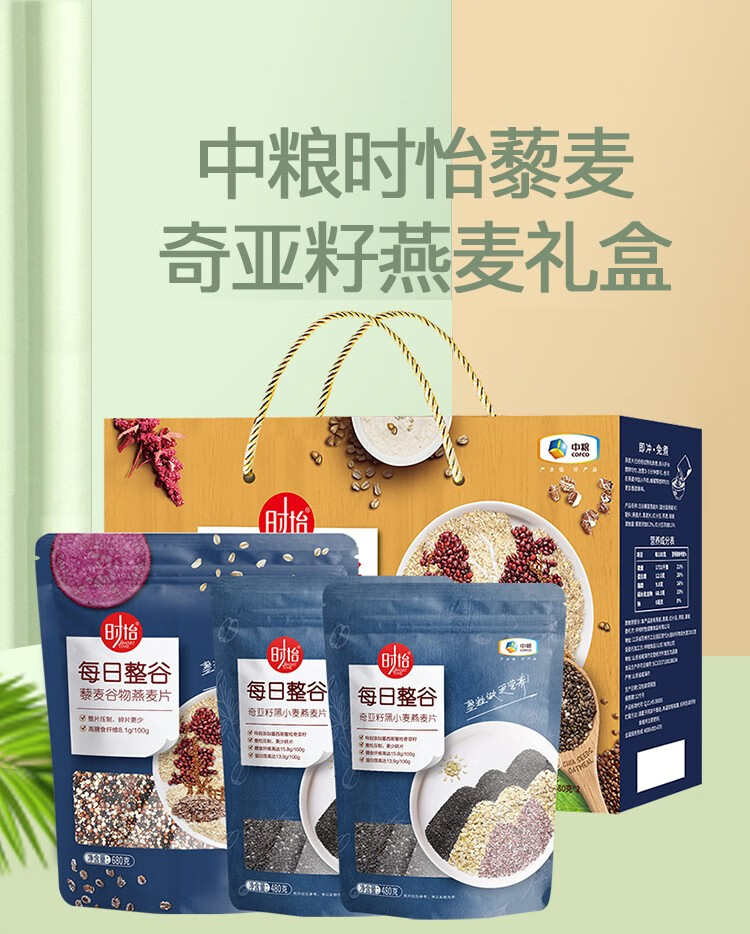 TY (分两个包裹)中粮时怡藜麦奇亚籽燕麦礼盒1640g/盒+元气森林白桃味苏打气泡水(480ml*15)【鲜享2.0】