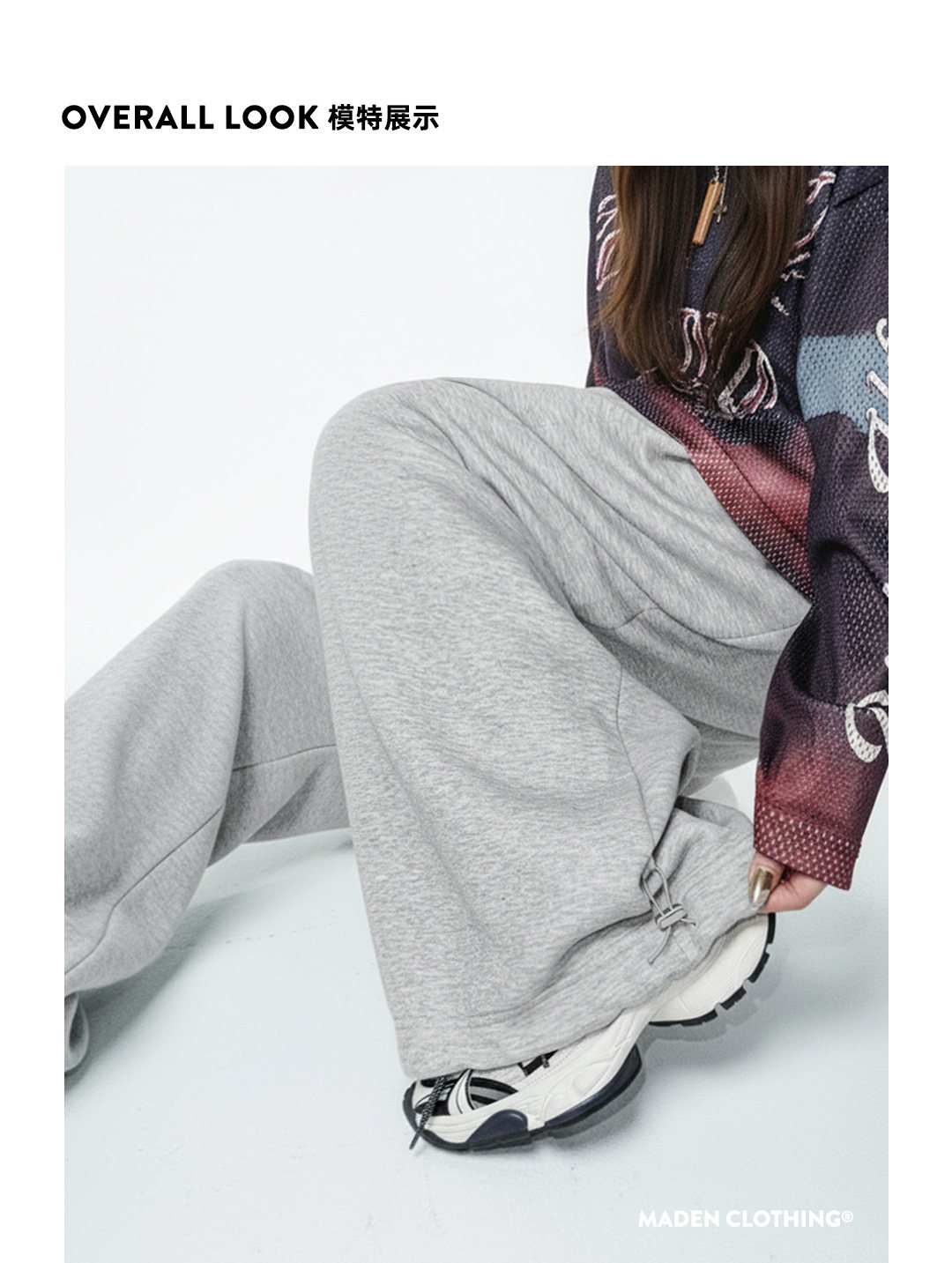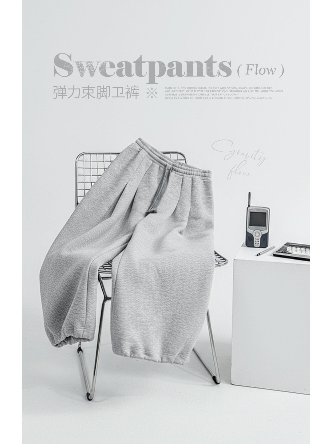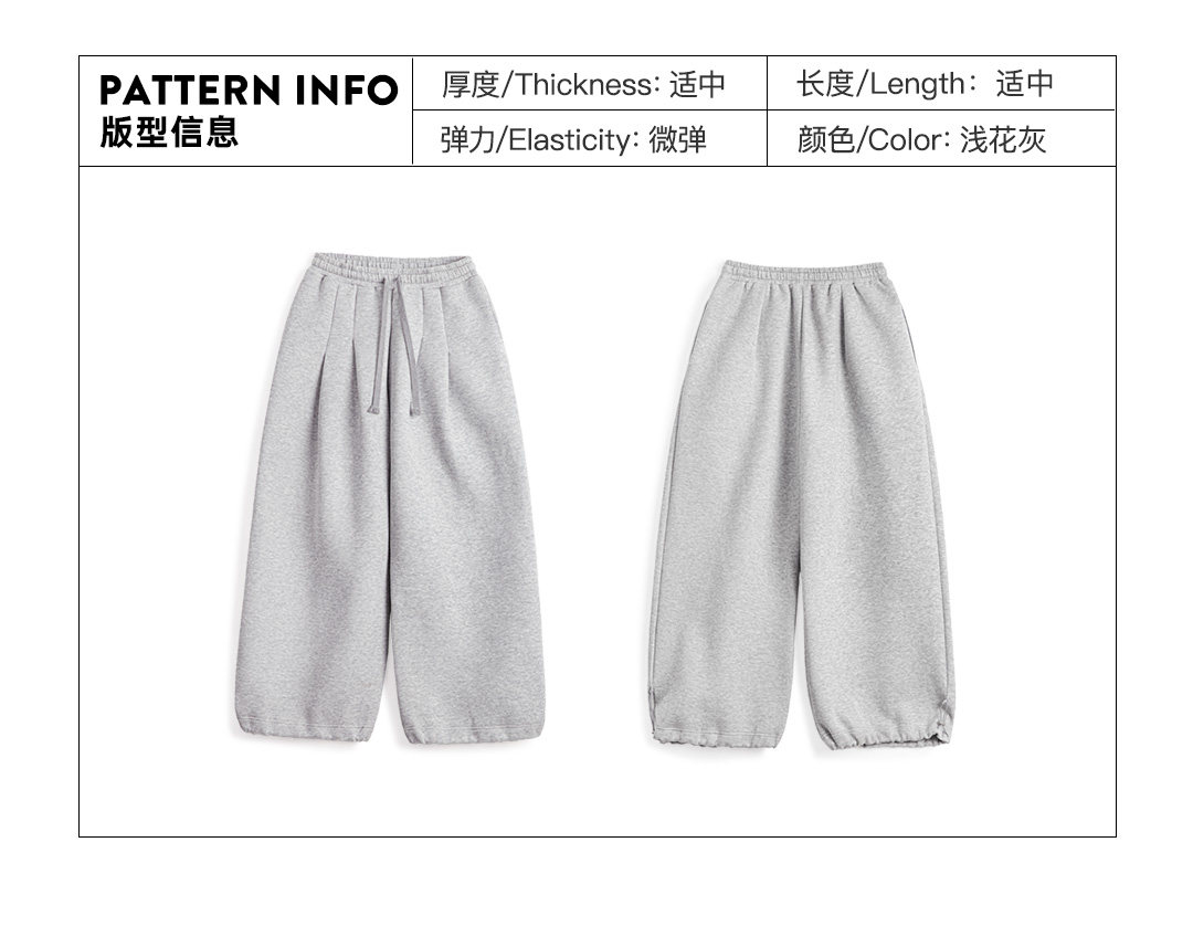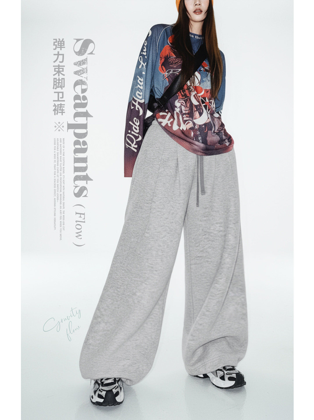 马登浅灰色阔腿直筒休闲长卫裤松紧腰抽绳束脚垂坠感糯米裤子女春