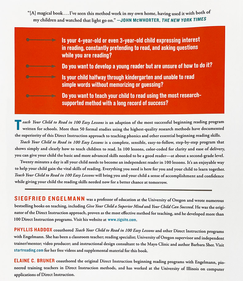 Teach Your Child to Read in 100 Easy Lessons is an adaption of Reading Mastery, the most successful reading program written for elementary schools. More than forty formal studieshave documented the superiority of Rading Mastery over other approaches.Teach Your Child to Read in 100 Easy Lessons is a complete, step-by-step program that shows patents—simply and clearly—how to teach their children to read.