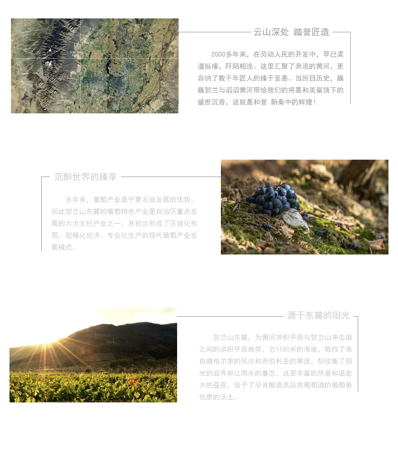 和誉新秦中酒庄位于宁夏贺兰山东麓葡萄产区,是中国最具潜力的优质葡萄酒产区,也是中国 葡萄酒明星产区,有着得天独厚生长酿酒葡萄的优势。酒庄地理位置靠近镇北堡西部影城、温泉小 镇、葡萄酒小镇、贺兰山岩画等著名旅游景点,和誉新秦中酒庄也积极拓展旅游度假项目:观光农 业、生态采摘、酒庄旅游、葡萄酒自酿等。所谓“天时、地利、人和”,和誉新秦中酒庄就是在这 样一个和谐的环境中,绘着和美的景,酿着醇和的酒......