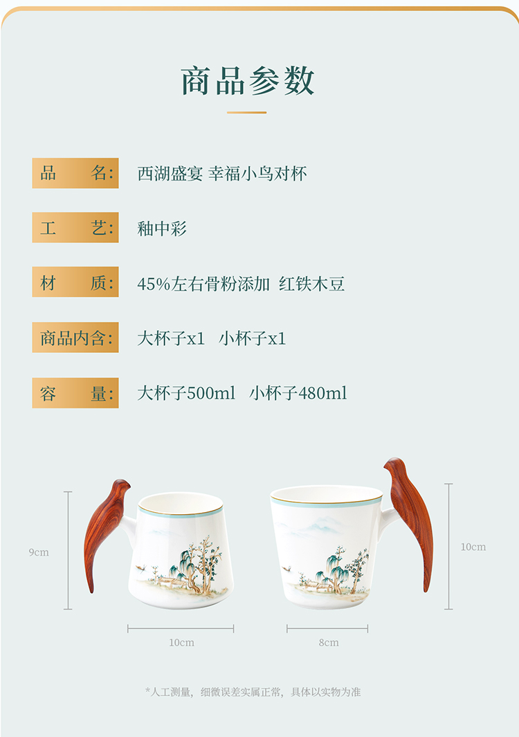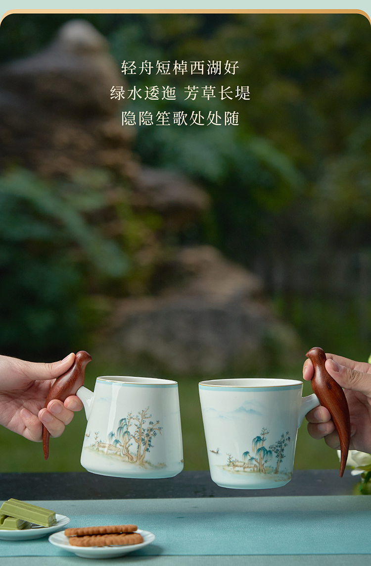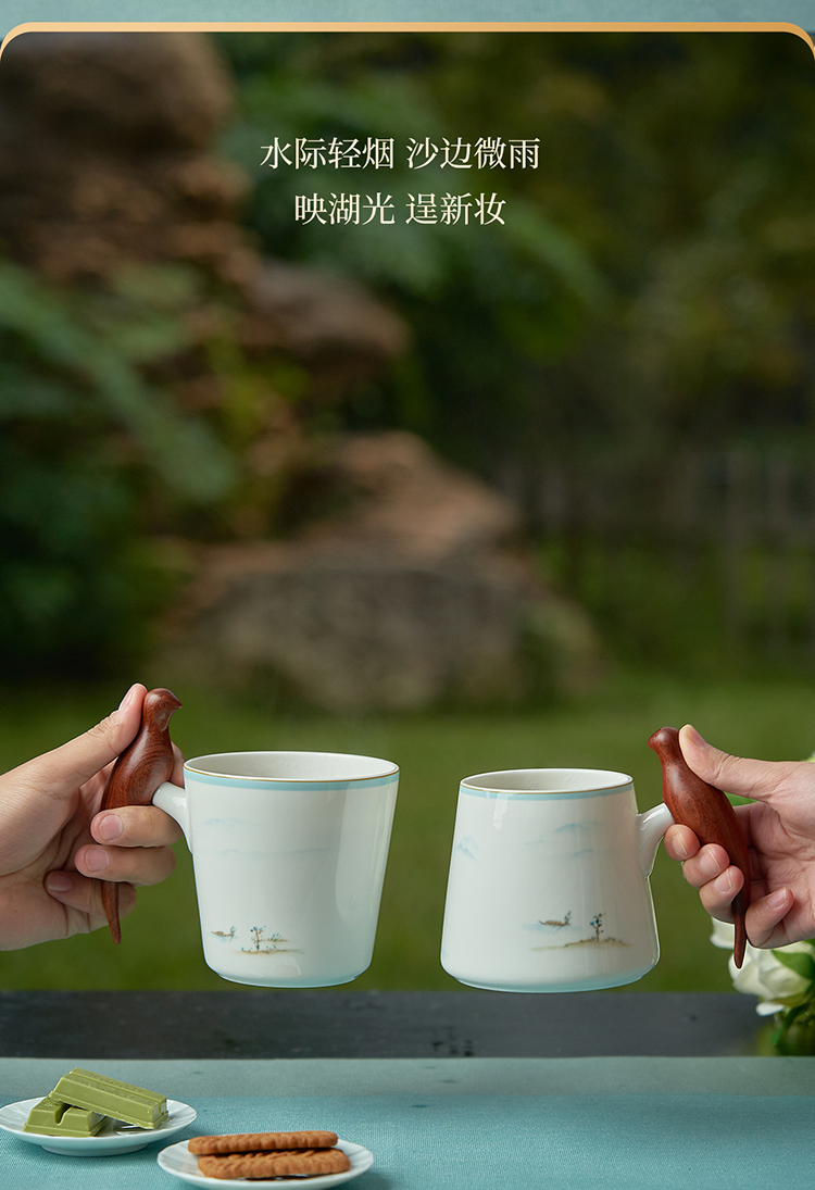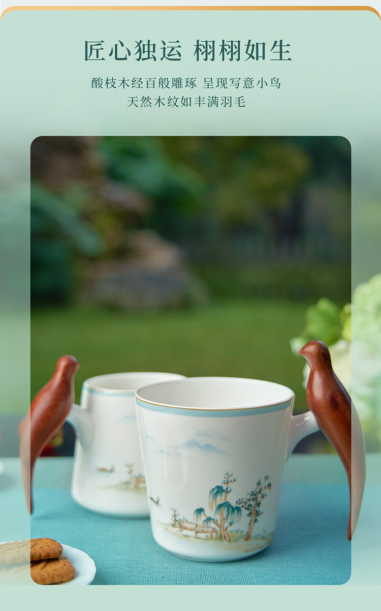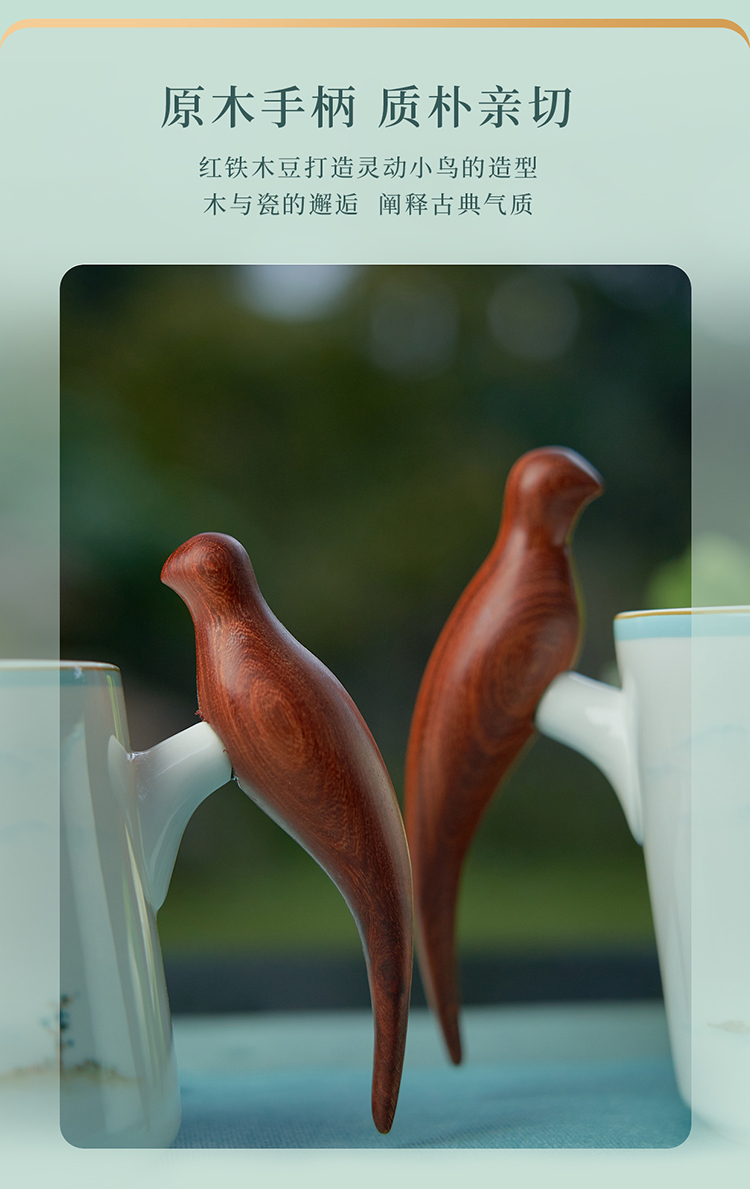 【6F】玛戈隆特西湖盛宴幸福小鸟对杯木把手 骨瓷家用情侣创意 礼盒包装