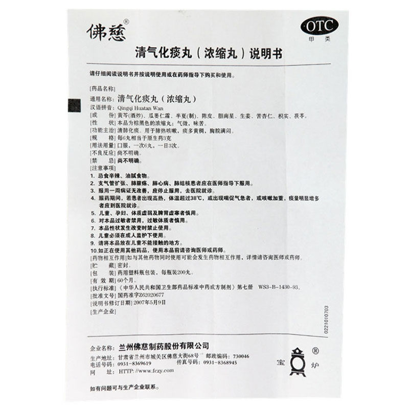 佛慈 清气化痰丸 200丸/盒浓缩丸清肺化痰用于肺热咳嗽痰多黄稠