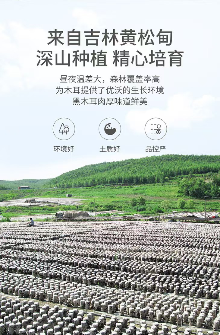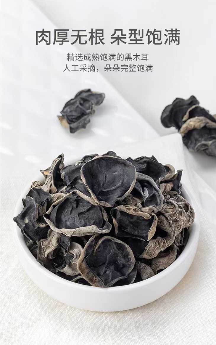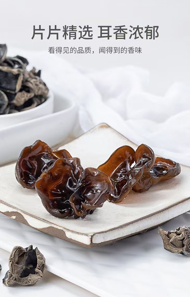 方家铺子的黑木耳,精选远离尘嚣的深山腹地,那里空气清新,土壤肥沃,为黑木耳的生长提供了最理想的环境。还采用优质椴木作为培养基,模拟自然生长条件,以确保黑木耳的营养价值与风味。再利用清澈的山泉水进行灌溉,水质纯净无污染,滋养出更加鲜美的黑木耳。自然生长的黑木耳在采摘后都经过人工除根,确保干净无杂质。多重筛选流程,严格把关,只保留色泽亮黑、形态饱满的优质黑木耳,密封后送到我们手中。