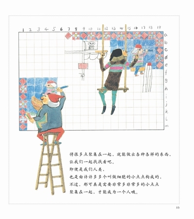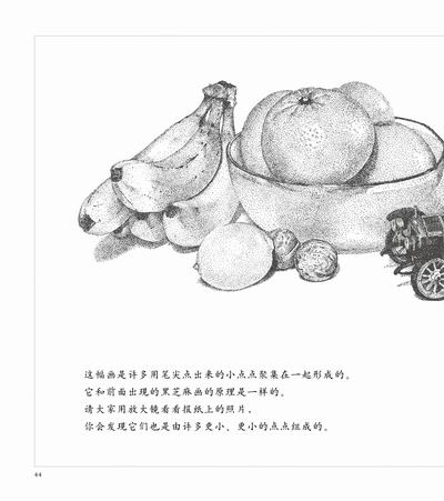 拿放大镜看一副画,可以看到是由许多个点构成;电视的每一个图像,是由红绿蓝三原色的小点构成;缝纫机车出的线,也是由一个个的点组成的。此处的“点”并非数学概念中的点,而是具有更广泛的含义,比如构成人体的细胞,宇宙的形成等等。从“点”这个小单位来探讨事物的构成,也即以微观的方式去看身边的事物,是不是会有很多新鲜的发现呢?