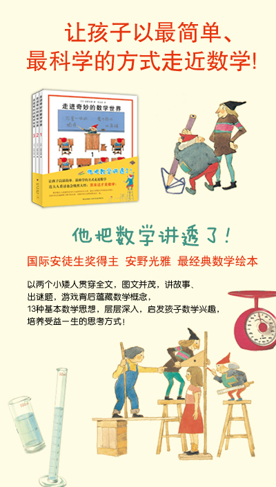 在这三本以数学为主题的绘本中,安野光雅从生活中司空见惯的现象、事物入手,用生动优美的图画,风趣幽默地呈现数学原理和概念的由来,通过有趣的游戏、手工和故事,让数学变得简单、好玩,引导孩子自己动手、思考、发现,启发孩子对数学的兴趣。