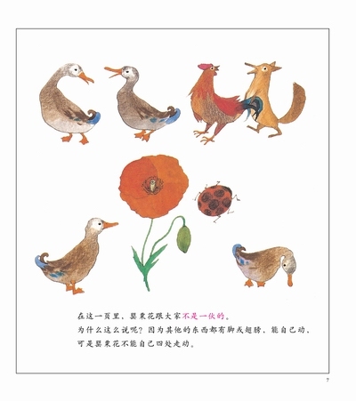 在同一页中,找出谁和大家“不是一伙的”,也就是找出不属于同一类的那个。例如,许多个方块和一个圆,圆和大家“不是一伙的”;不能自己运动的,和能用脚或翅膀活动的“不是一伙的”;自行车和其他有发动机的交通工具“不是一伙的”。形状、颜色、生长环境、数目……都可以是分类的条件。通过巧妙的游戏,作者让孩子们理解分类。分类的条件可以有很多种,相应地得出的结果就会不同,这也能让孩子了解到事物是可以从多种角度来看待的。