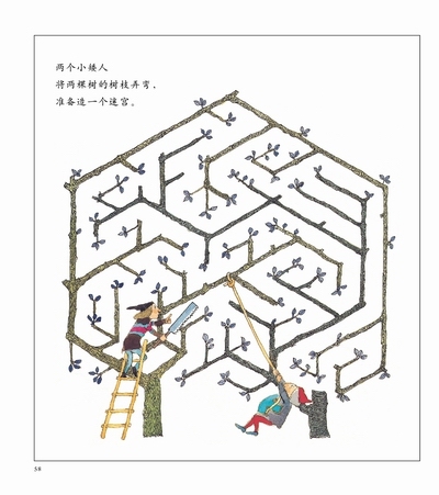 两个小矮人调制了两种魔药,一种可以让物体横向伸缩,一种可以让物体纵向伸缩,涂抹不同的魔药,物体就有被压缩或拉伸的感觉。站在高楼上俯身往下看,拿着书横着看过去,物体的长度并未改变,视觉感受却不一样。不过,不管图形怎么变化,两只眼睛不会变成三只,嘴巴也不会跑到鼻眼睛上面去――这便是变化中的“不变”。本章通过有趣的游戏,让孩子们从生活中发现拓扑学。