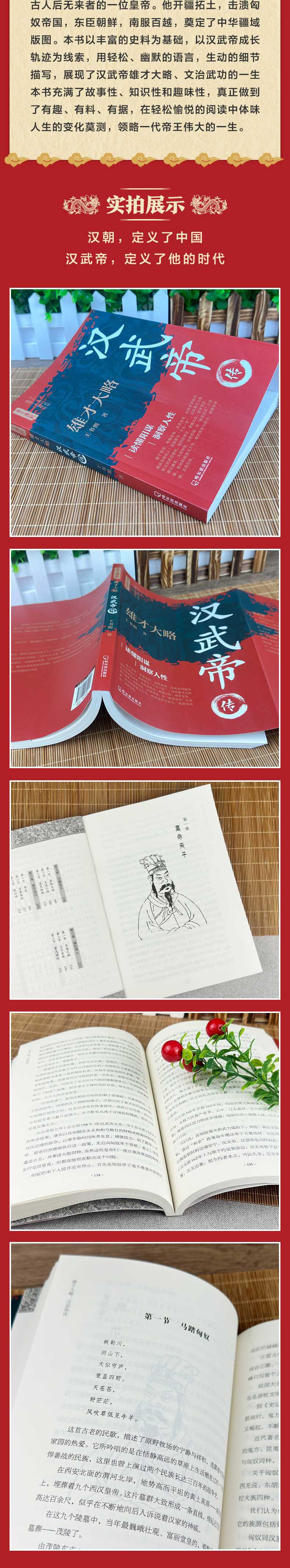 人物魅力与历史地位雄才大略的皇帝:汉武帝刘彻是西汉第七位皇帝,以其非凡的雄才大略和远见卓识,成为中国古代历史上最伟大的皇帝之一。从4岁封王、7岁为太子到16岁登基,汉武帝的一生充满了传奇色彩。他统治期间,西汉国力达到巅峰,对后世产生了深远影响。2、详细的历史记录与评价本书基于大量详实的史料,生动地再现了汉武帝一生的历史场景和重大事件。书中对汉武帝在政治、经济、外交、民族关系上的历史功绩做了中肯的评价,为读者提供了全面、客观的历史视角。3、生动的文笔与可读性作者以生动的笔法描绘了汉武帝及其时代的历史场景和人物形象,使读者仿佛置身于那个波澜壮阔的时代。本书不仅学术价值高,而且可读性强,适合广大读者阅读和学习。4、社会效益