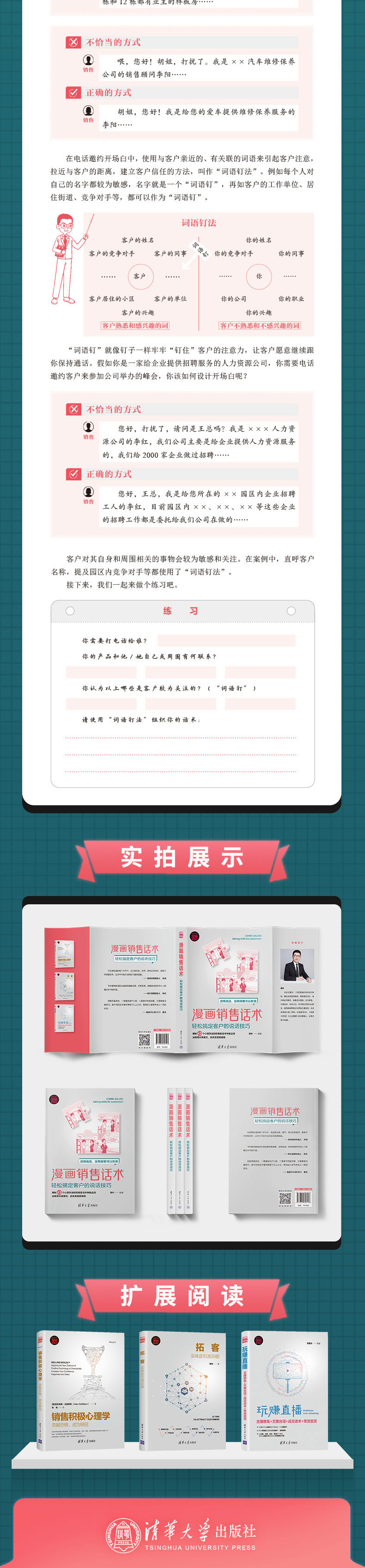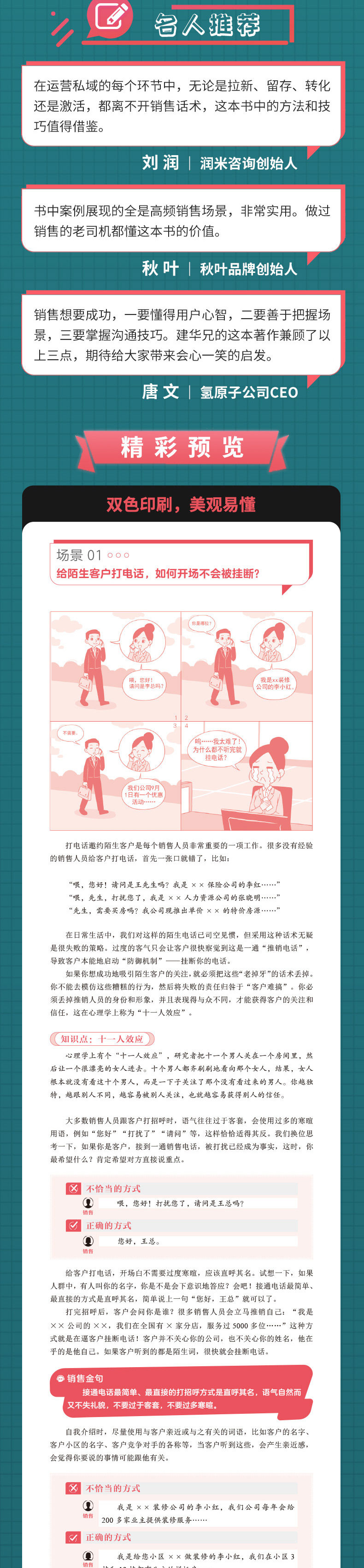 第一章链接客户 场景01给陌生客户打电话,如何开场不会被挂断?2 场景02如何邀约客户更容易成功?7 场景03客户说“时间定不下来”,该如何应对?12 场景04如何加客户微信不容易被拒绝?17 场景05加完客户微信,如何发第一条信息?21 场景06给客户微信发什么,客户会马上回复你?25 第二章建立信任 场景07客户说“没听过你们这个牌子”,如何应对?30 场景08刚接触客户,如何避免客户抗拒?35 场景09客户问“产品效果好吗”,如何回应?40 场景10如何赞美客户,客户招架不住?45 场景11获得客户信任最有杀伤力的话是什么?49 场景12与客户对话陷入僵局,如何一句话挽回信任?53 第三章了解需求 场景13客户上来就问“最低多少钱”,如何回应?58 场景14客户说“我随便看看”,如何应对?62 场景15为什么你提的问题,客户总是不愿回答?66 场景16向客户提问,如何问到点子上?70 场景17挖到客户的痛点,是否应该马上推荐产品?74 第四章推荐产品 场景18客户问“能否推荐一款好点的产品”,如何回应?80 场景19客户问“请问××款还有吗”,如何回应?84 场景20客户问“这款产品好在哪儿呢”,如何回应?88 场景21如何让客户听懂艰涩的产品概念?92 场景22客户说“两款都挺好,不知该选哪款”,如何应对?97 第五章处理异议 场景23客户问“你的产品比别人的好在哪里呢”,如何回应?102 场景24客户说“你们家款式太少了”,如何应对?106 场景25客户的同伴说你的产品一般,如何应对?110 场景26客户问“你能保证效果吗”,如何正确回应?114 场景27客户问“不要赠品,能否折现呢”,如何回应?118 场景28客户问“如果不满意,可以退货吗?”,如何回应?122 漫画销售话术5校文前.indd4 第六章讨价还价 场景29客户说“你们家的东西卖得比别人家的贵”,如何应对?128 场景30客户问“东西能再便宜点吗”,如何回应?132 场景31客户说“太贵了”,如何应对?136 场景32客户说“预算不够”,如何应对?141 场景33客户说“不打折的话就不买了”,如何应对?145 第七章促使成交 场景34客户说“这款产品挺好的”,如何快速签单?150 场景35客户说“我再考虑一下”,如何应对?155 场景36客户说“我要和××商量商量”,如何应对?159 场景37客户说“到别处再转转”,如何应对?164 场景38客户说“需要的话我再联系你”,如何应对?168 第八章裂变扩增 场景39客户说“效果好的话,我帮你推荐”,如何应对?172 场景40如何要求客户转发朋友圈,客户会欣然同意?176 场景41如何求老客户帮你介绍新客户?180 场景42异业合作洽谈,如何让对方愿意给你带单?184 场景43如何进行一场精彩的销售演讲?189 |