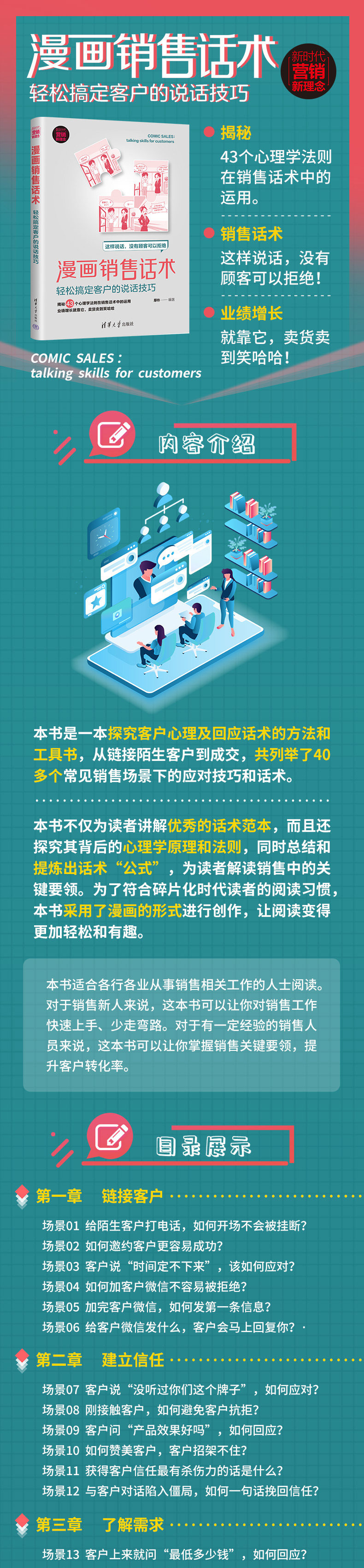 本书是一本探究客户心理及回应话术的方法和工具书,从链接陌生客户到成交,共列举了40多个常见销售场景下的应对技巧和话术。本书不仅为读者讲解优秀的话术范本,而且还探究其背后的心理学原理和法则,同时总结和提炼出话术“公式”,为读者解读销售中的关键要领。为了符合碎片化时代读者的阅读习惯,本书采用了漫画的形式进行创作,让阅读变得更加轻松和有趣。 本书适合各行各业从事销售相关工作的人士阅读。对于销售新人来说,这本书可以让你对销售工作快速上手、少走弯路。对于有一定经验的销售人员来说,这本书可以让你掌握销售关键要领,提升客户转化率。 |