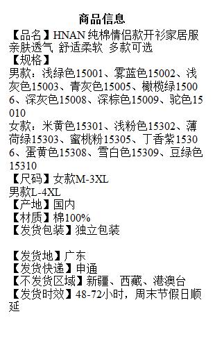 HNAN 纯棉情侣款开衫家居服 睡衣 亲肤透气 舒适柔软 多款可选