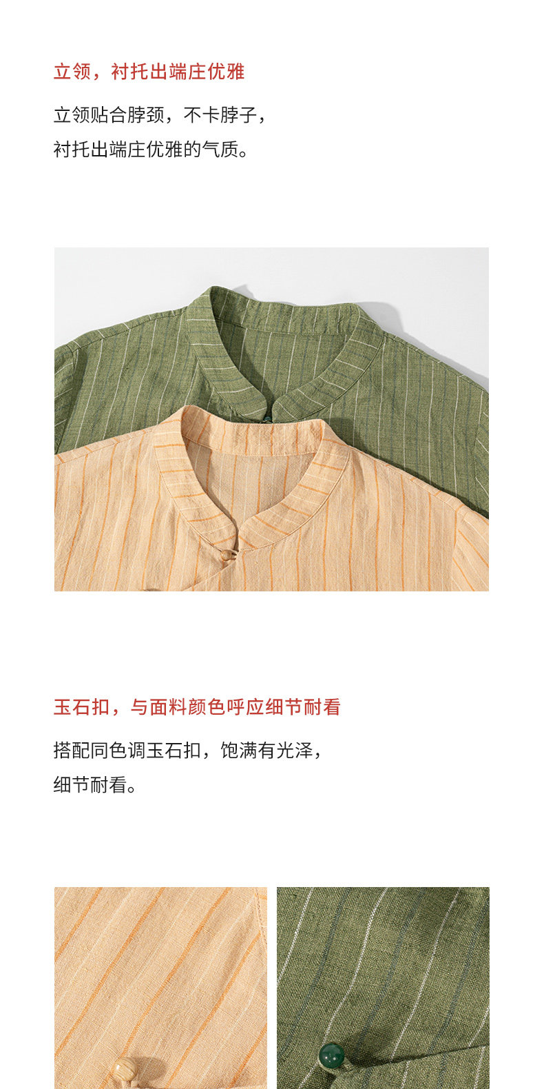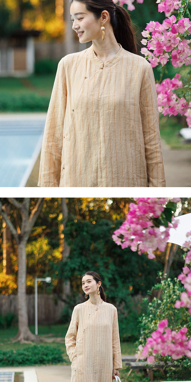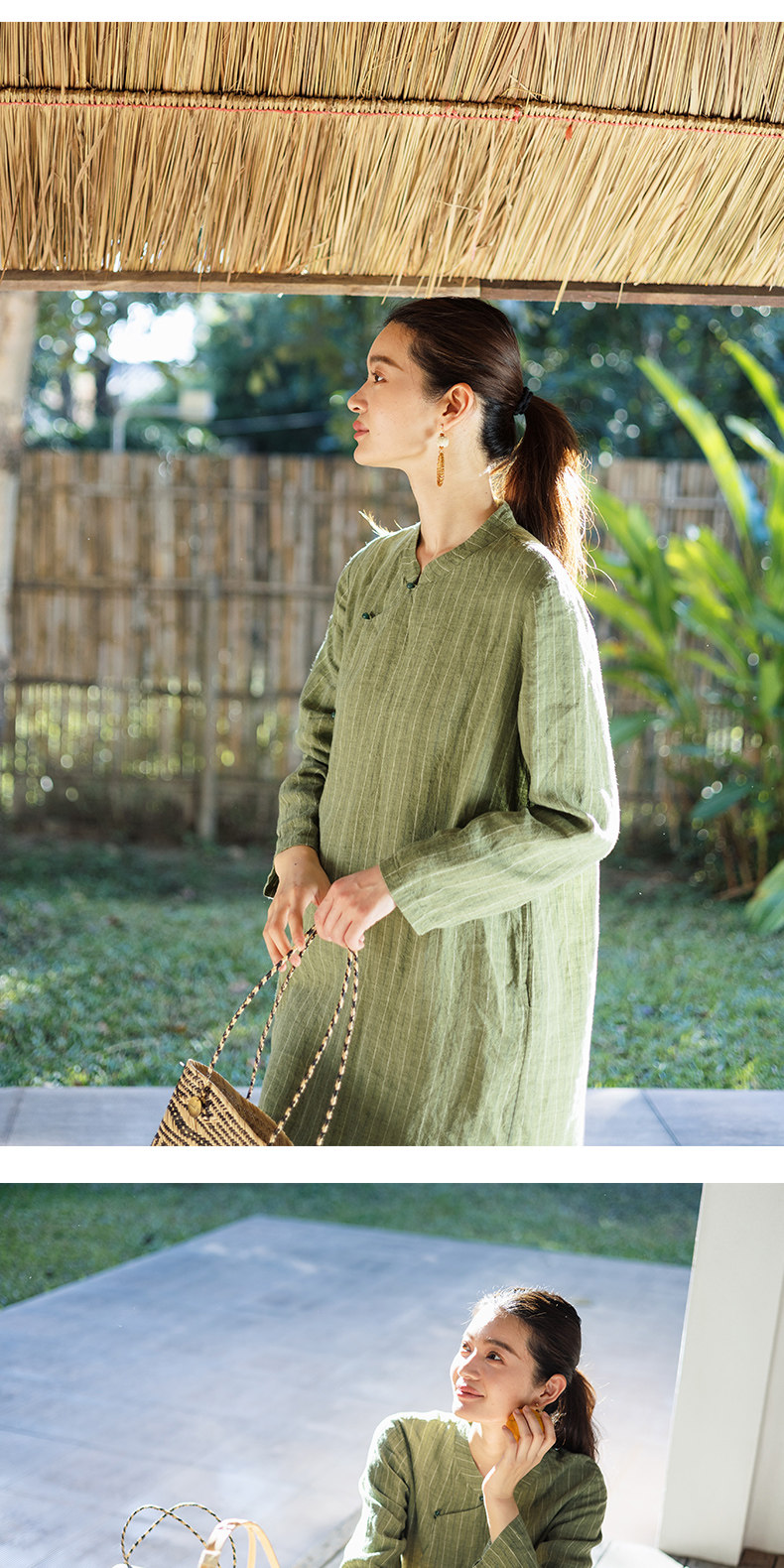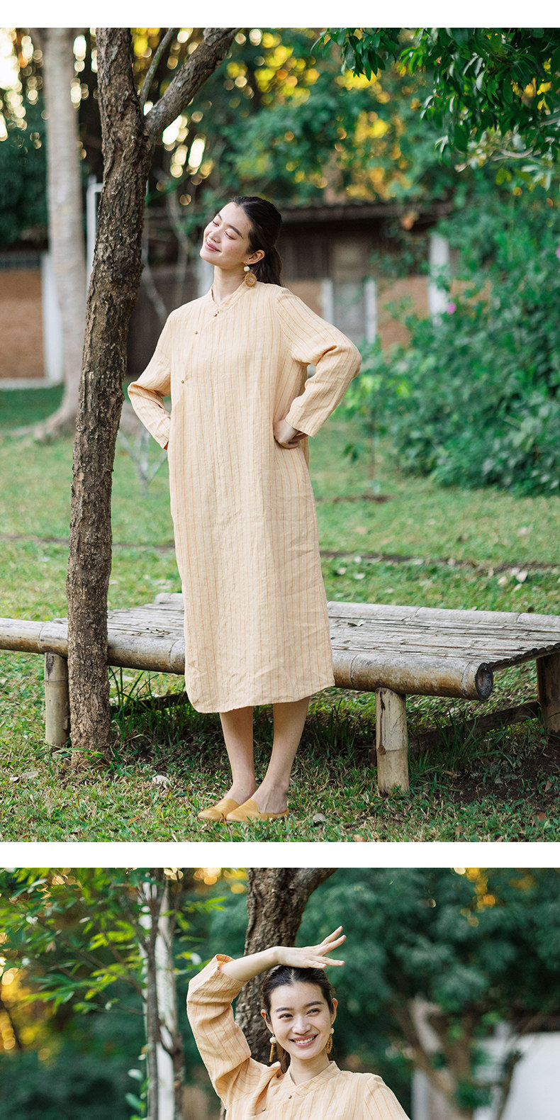 特绽放125朵/岁月静好*色织亚麻条纹新中式立领斜襟七分袖连衣裙