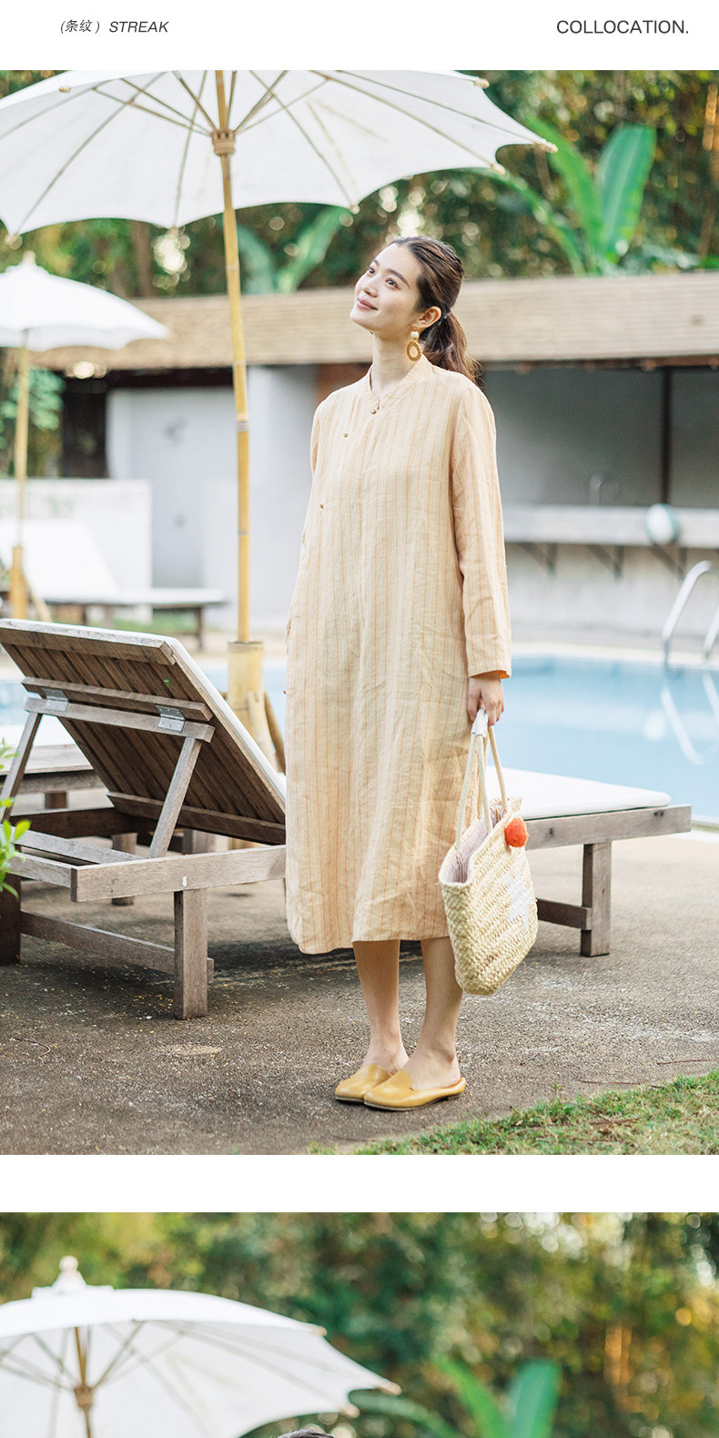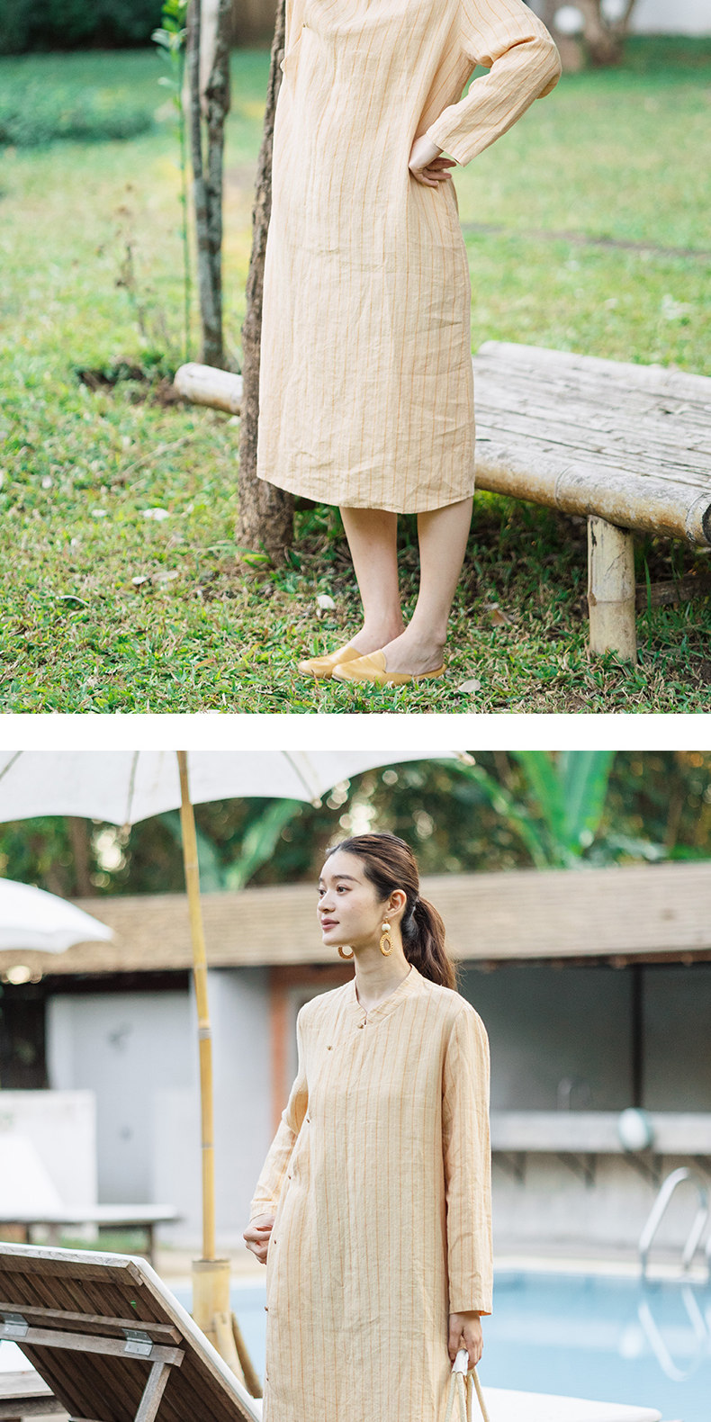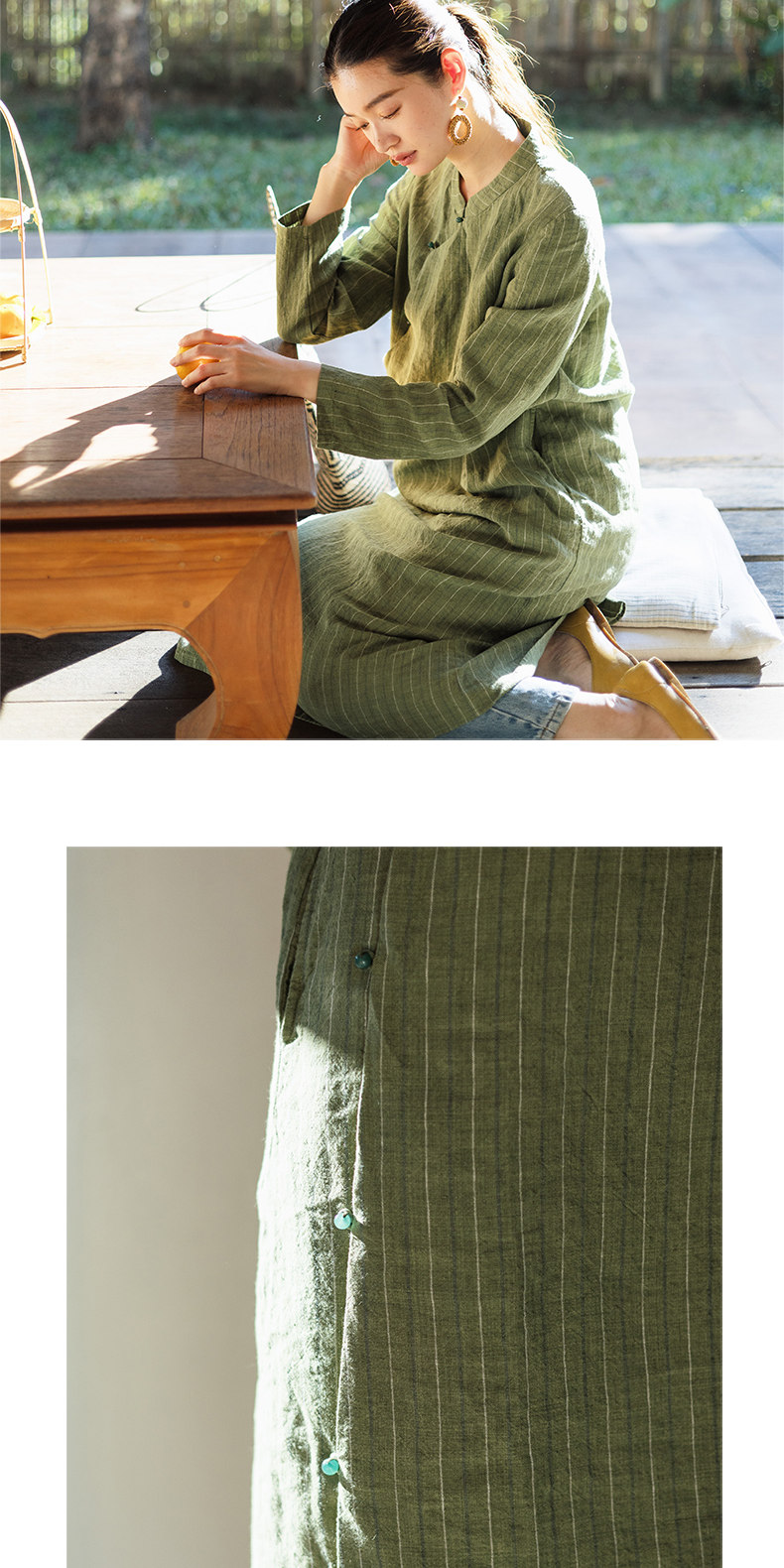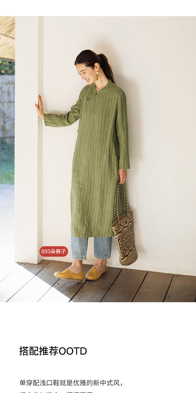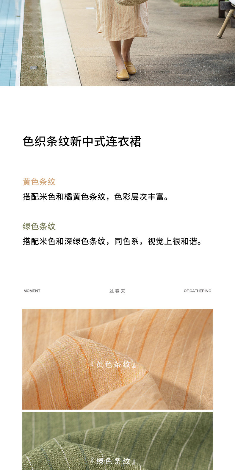 特绽放125朵/岁月静好*色织亚麻条纹新中式立领斜襟七分袖连衣裙