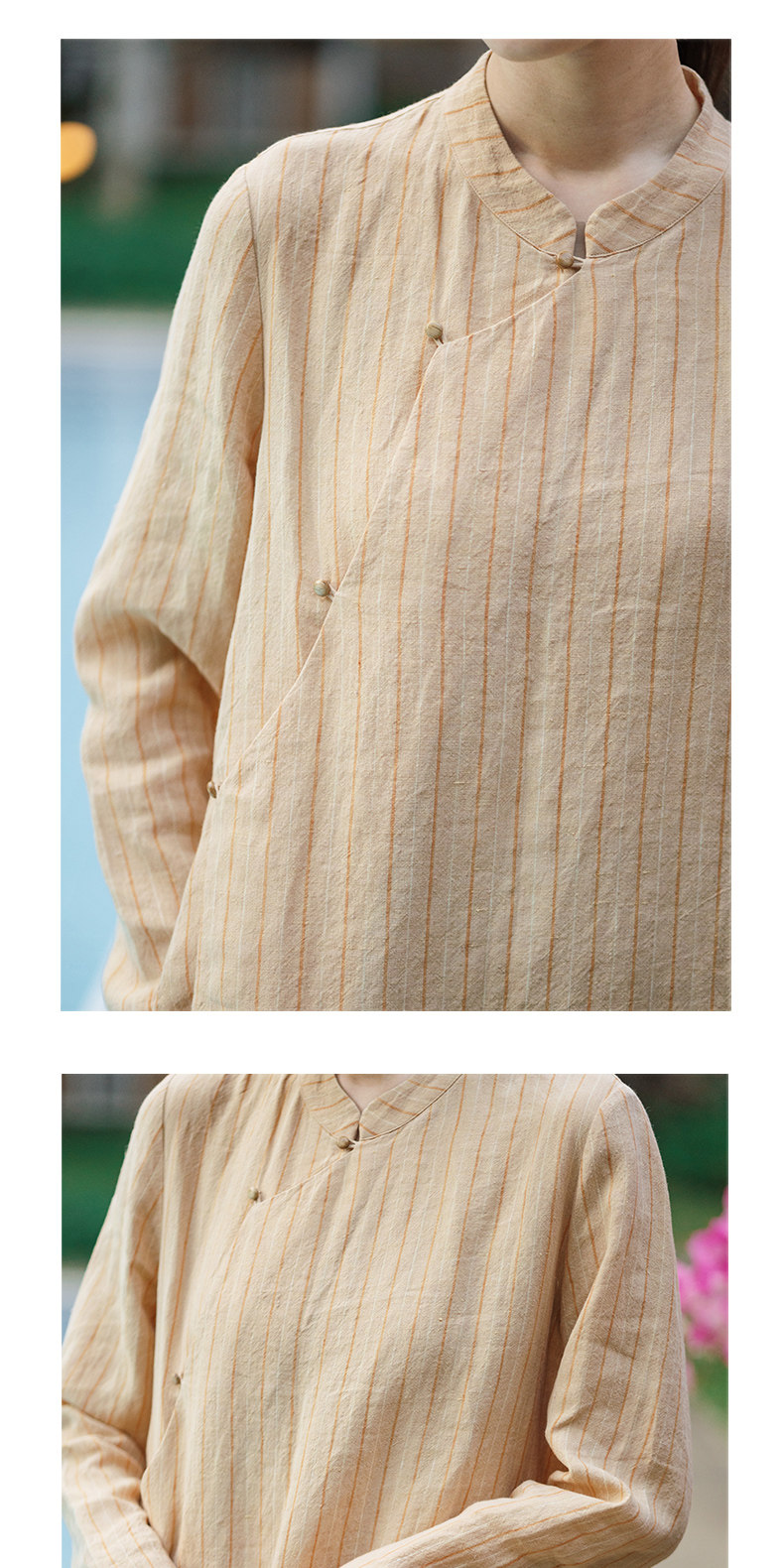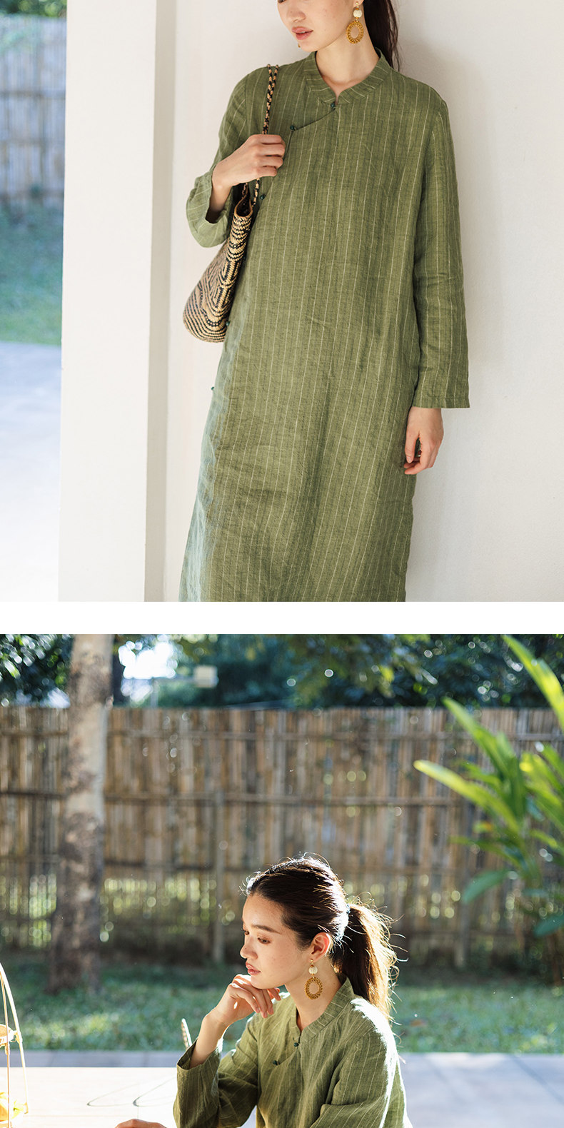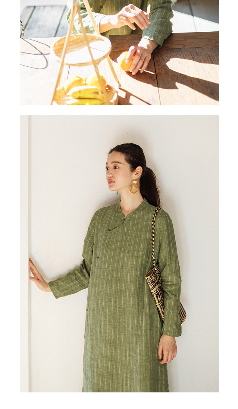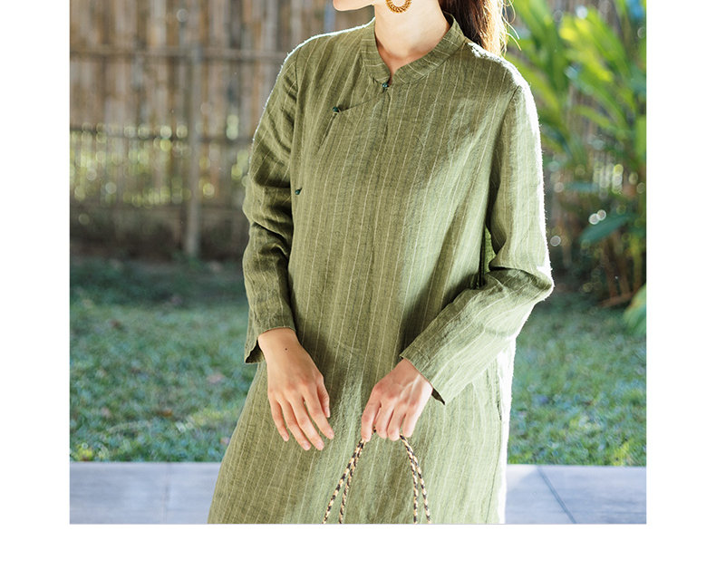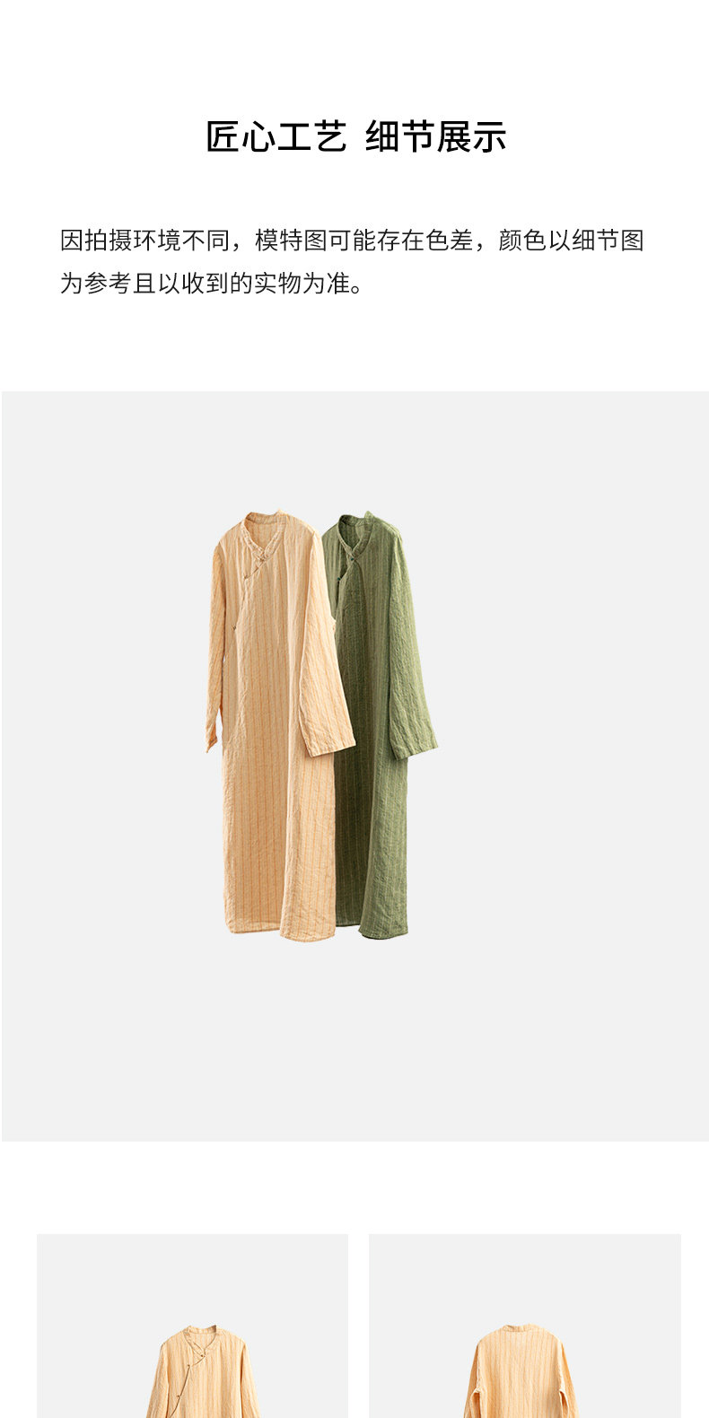 特绽放125朵/岁月静好*色织亚麻条纹新中式立领斜襟七分袖连衣裙