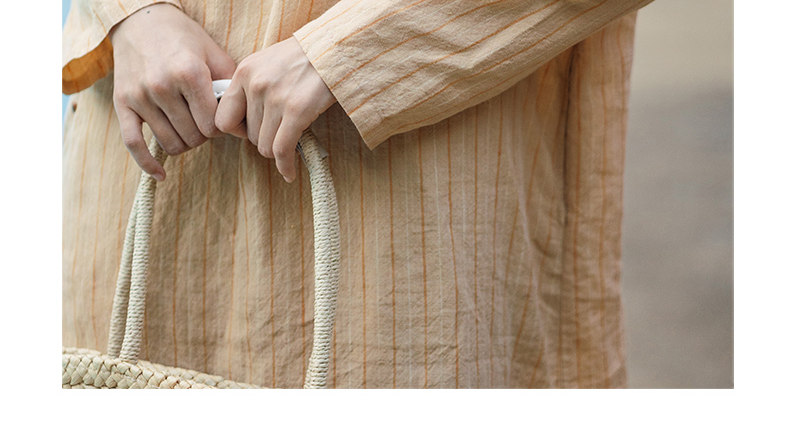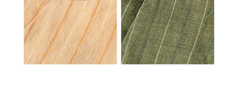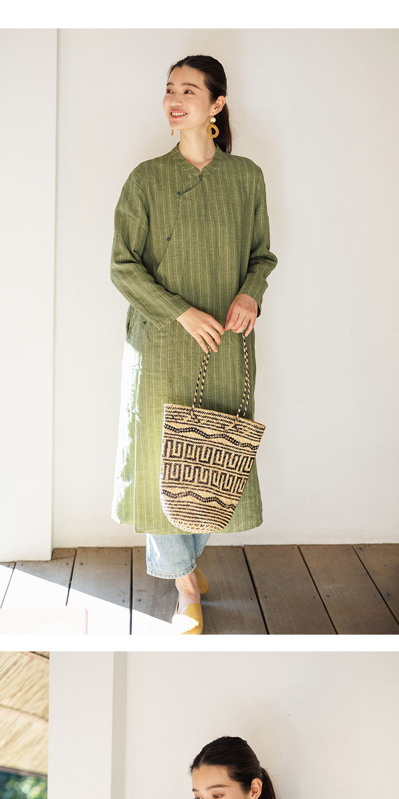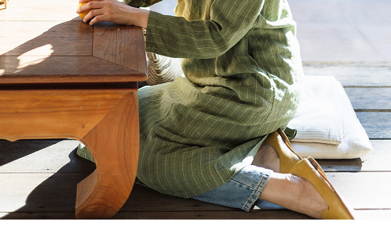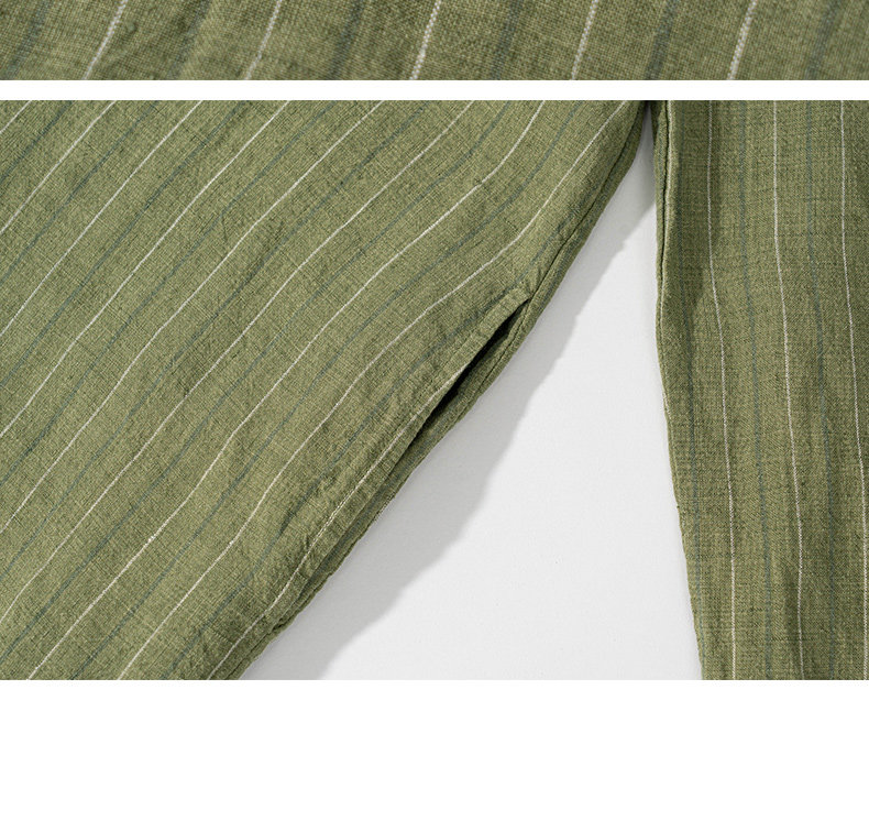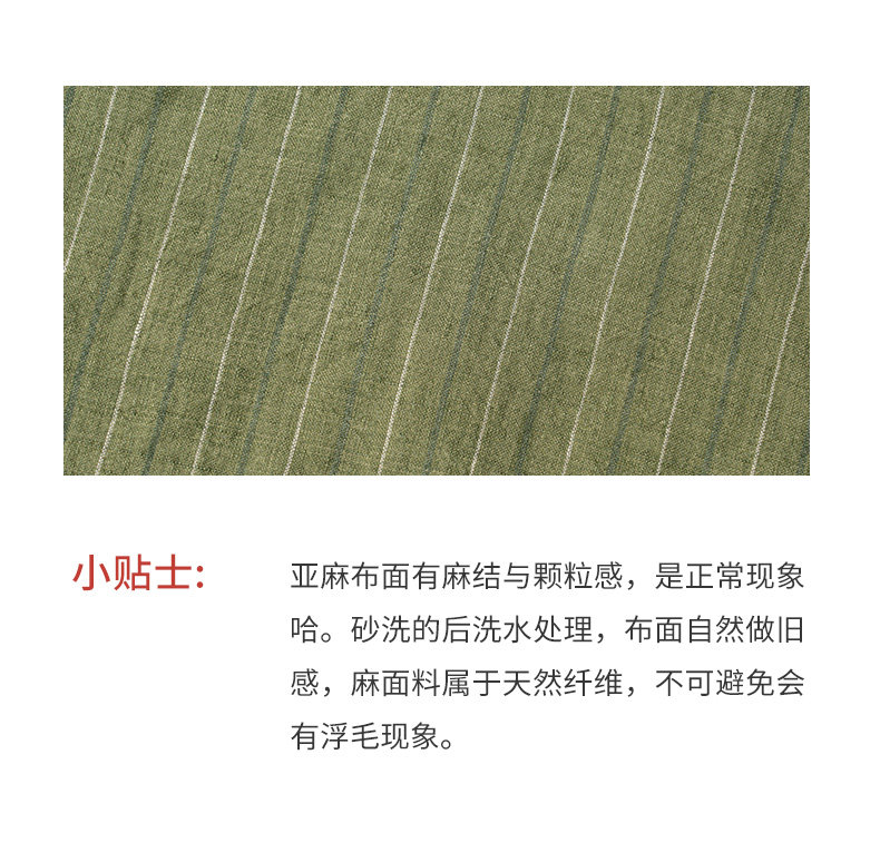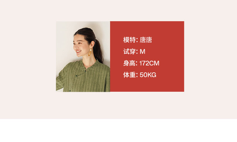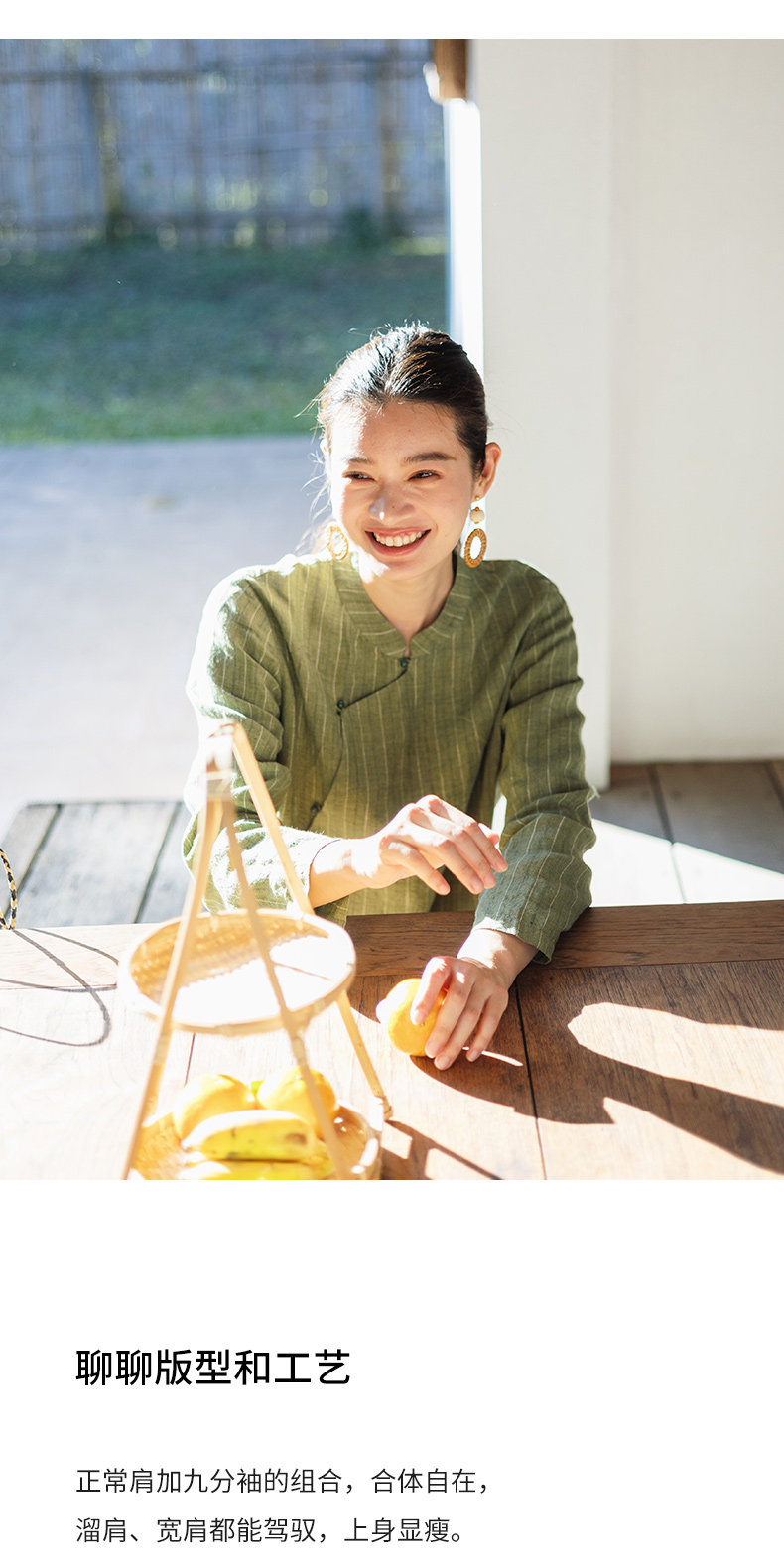 特绽放125朵/岁月静好*色织亚麻条纹新中式立领斜襟七分袖连衣裙