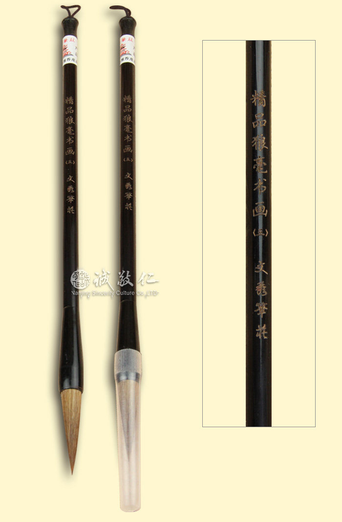 【基本信息】 产品材质:竹+狼毫 狼毫,毛笔的一种,用黄鼠狼(鼬鼠)毛制成,故名。特点是润滑而富有弹性,宜书宜画,以画为主。梁同书《笔史·狼毫》:“笔有丰狐、蟓蛉、龙筋、虎仆及猩猩毛、狼豪(毫)。”狼毫其力介乎羊毫、紫毫之间。质较脆,不耐摩擦。狼毫的吸水量大,较硬,容易掌握。 产品规格:笔杆长23.0cm,笔毛长4.0cm 【产品文化】 笔 最早的毛笔,大约可追溯到二千多年之前。西周以上虽然迄今尚未见有毛笔的实物,但从史前的彩陶花纹、商代的甲骨文等上可觅到些许用笔的迹象。东周的竹木简、缣帛上已广泛使用毛笔来书写。湖北省随州市擂鼓墩曾侯乙墓发现了春秋时期的毛笔,是目前发现最早的笔。其后,湖南省长沙市左家公山出土的战国笔,湖北省云梦县睡虎地、甘肃省天水市放马滩出土的秦笔,及长沙马王堆、湖北省江陵县凤凰山、甘肃省武威市、敦煌市悬泉置和马圈湾、内蒙古自治区古居延地区的汉笔,武威的西晋笔等都是上古时代遗存的不可多得的宝贵资料。 古笔的品种较多,从笔毫的原料上来分,就曾有兔毛、白羊毛、青羊毛、黄羊毛、羊须、马毛、鹿毛、麝毛、獾毛、狸毛、貂鼠毛、鼠须、鼠尾、虎毛、狼尾、狐毛、獭毛、猩猩毛、鹅毛、鸭毛、鸡毛、雉毛、猪毛、胎发、人须、茅草等。从性能上分,则有硬毫、软毫、兼毫。从笔管的质地来分,又有水竹、鸡毛竹、斑竹、棕竹、紫擅木、鸡翅木、檀香木、楠木、花梨木、况香木、雕漆、绿沉漆、螺细、象牙、犀角、牛角、麟角、玳瑁、玉、水晶、琉璃、金、银、瓷等,不少属珍贵的材料。 |