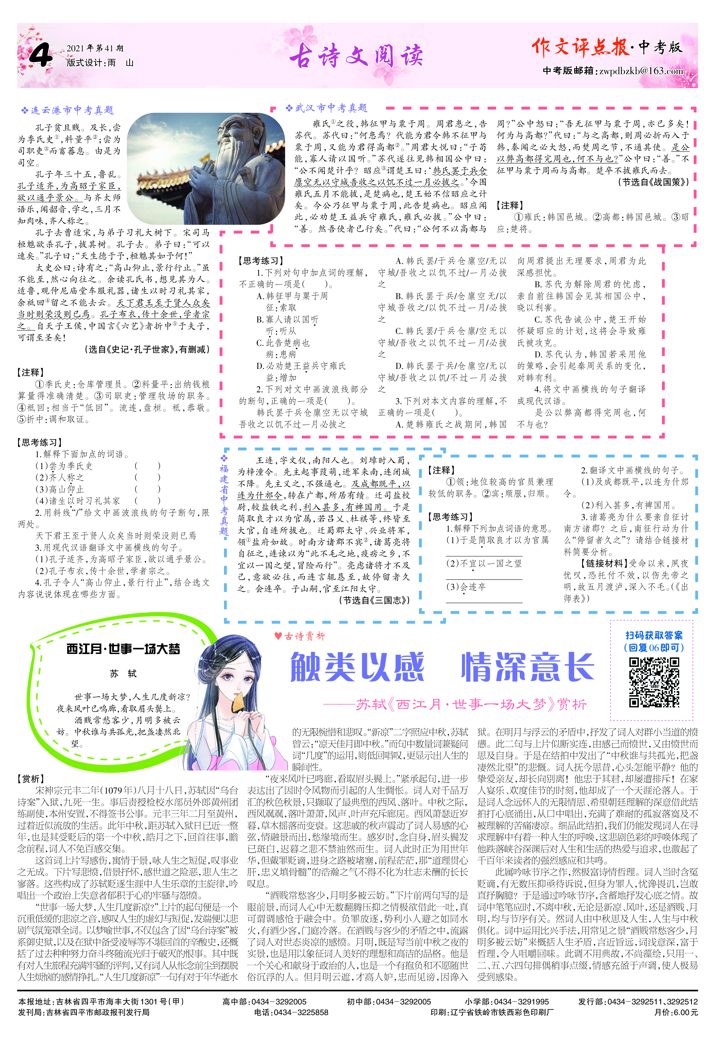 三、增值服务。订阅《作文评点报》,每月可获赠“作文支招”微课、作文素材包或中考、高考考前押题卷等,扫码获取。