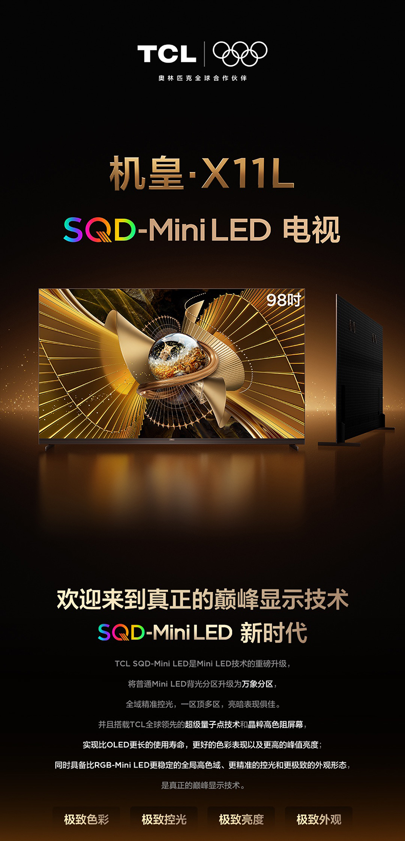 【新品上市】TCL电视 98X11L 98英寸 SQD-Mini LED机皇 100%全局高色域 超级蝶翼华曜屏 万象分区 约2cm至薄