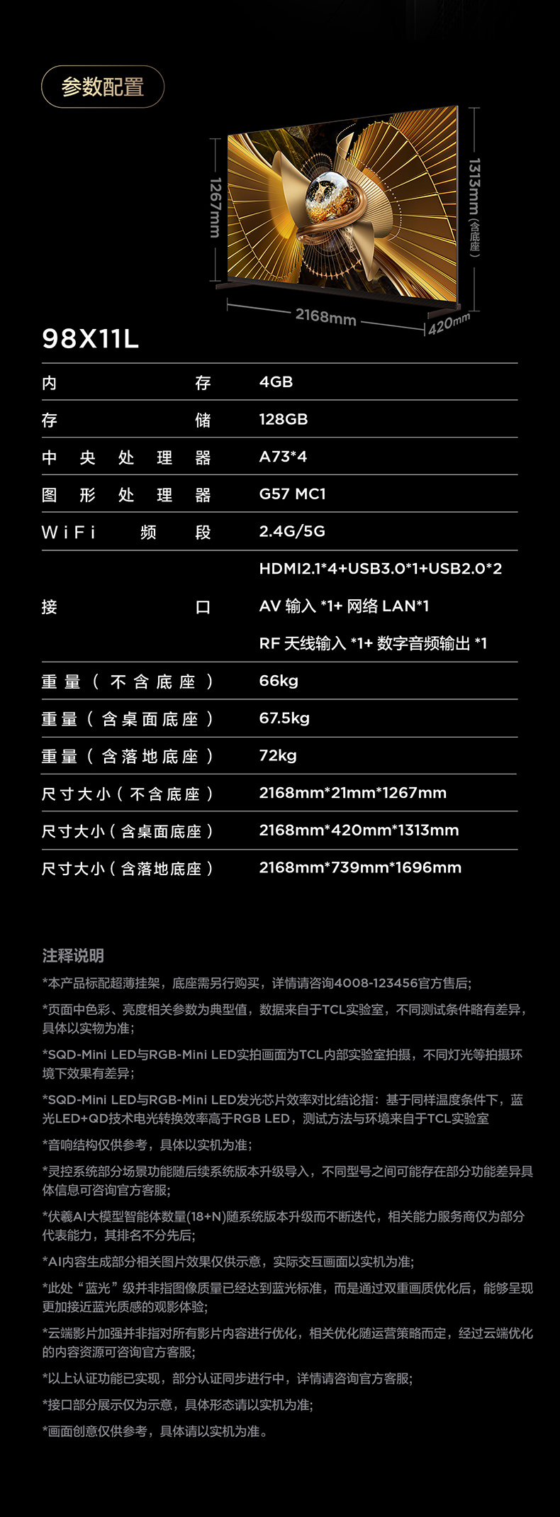 【新品上市】TCL电视 98X11L 98英寸 SQD-Mini LED 100%全局高色域 超级蝶翼华曜屏 万象分区 约2cm至薄