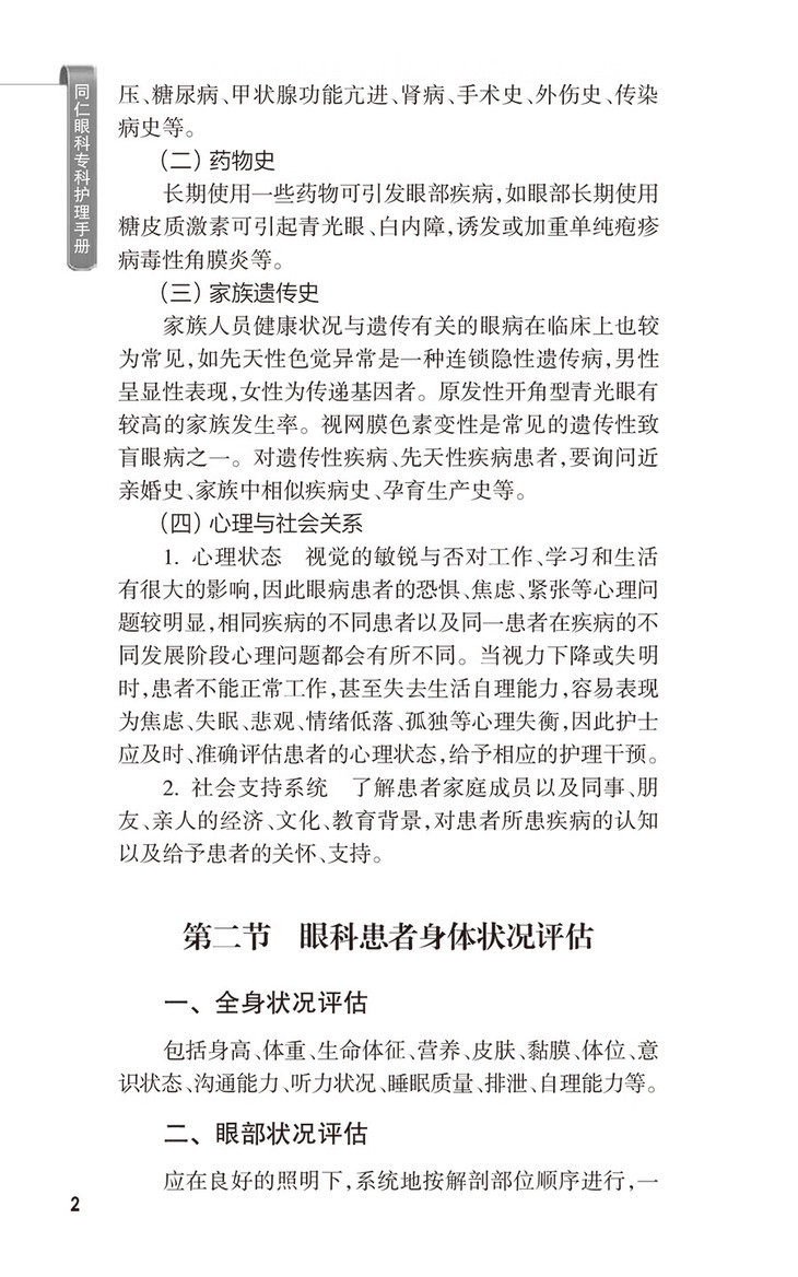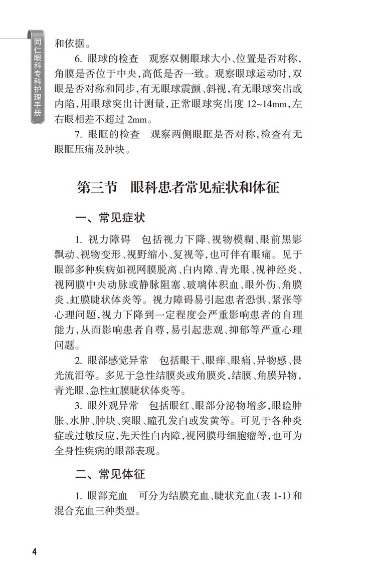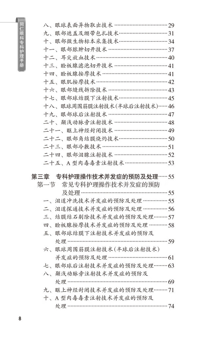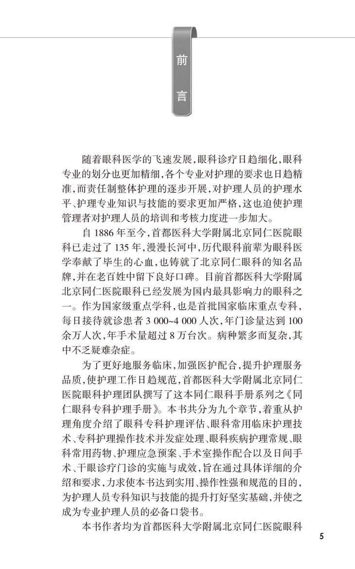 本书为“同仁眼科手册”系列中的一本,同仁眼科手册系列以“侧重临床,重点突出,简明扼要,易学好记"为特色,目前已出版9种。本书共分为十个章节,着重从护理角度介绍了眼科专科护理评估、常用临床护理技术、专科护理操作技术并发症处理、眼科疾病护理常规、眼科常用药物、护理应急预案、手术室操作配合以及日间手术和干眼诊疗门诊的实施与成效,旨在通过具体介绍和要求,力求达到实用、操作性强和规范的目的,为护理人员专科知识与技能的提升打好坚实基础,并使之成为专业护理人员的必备口袋书。