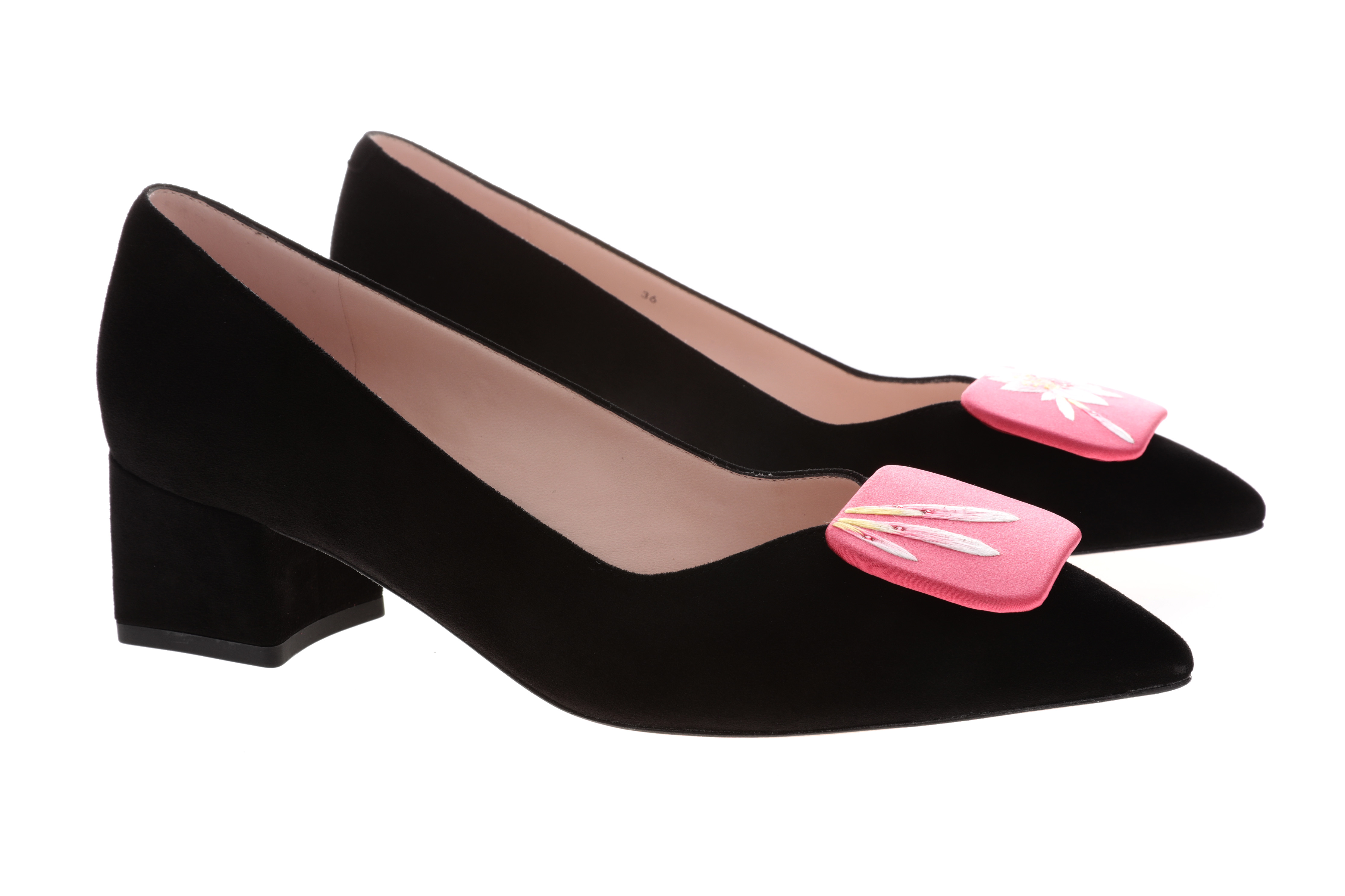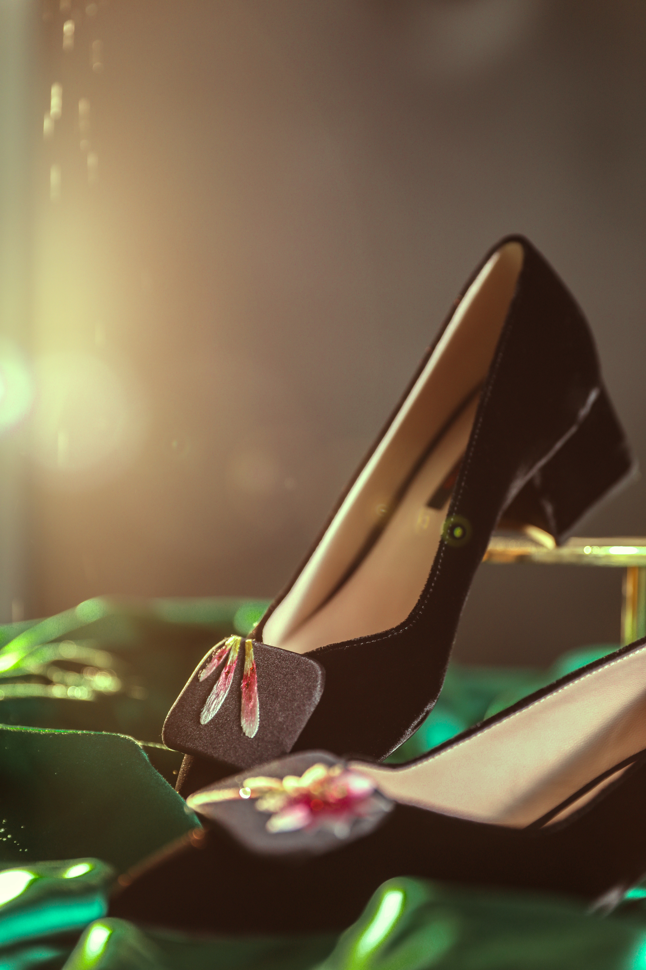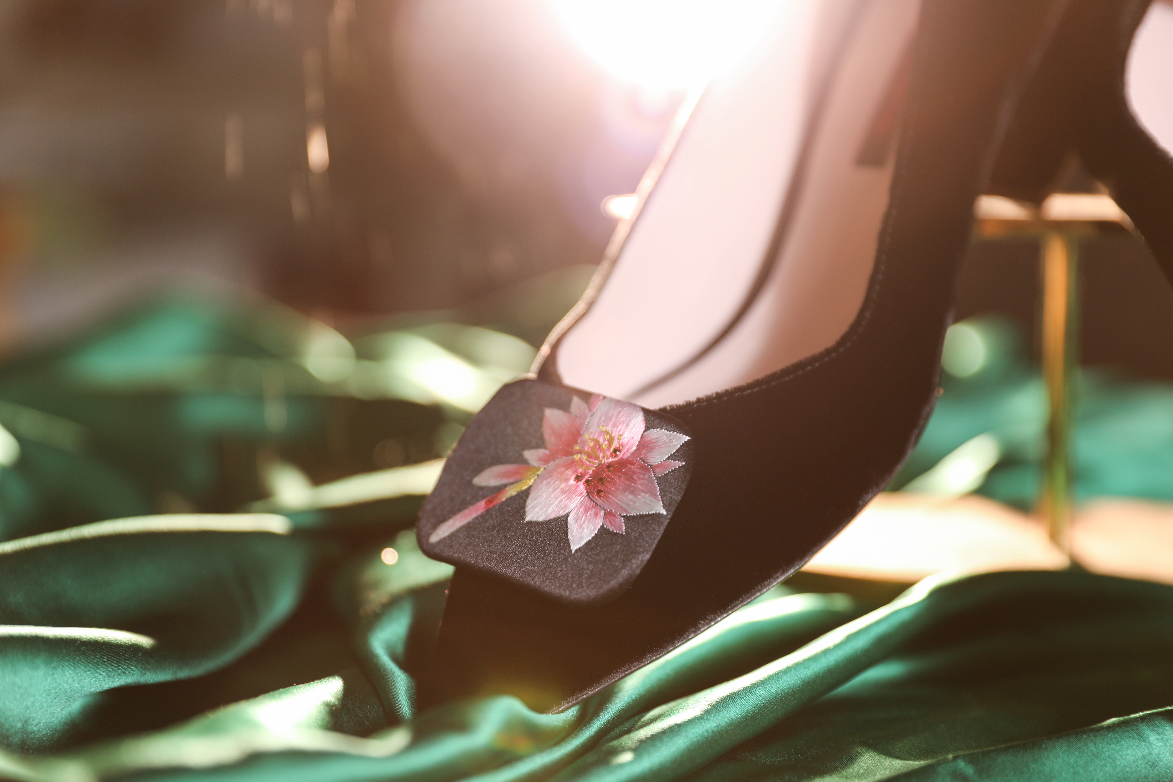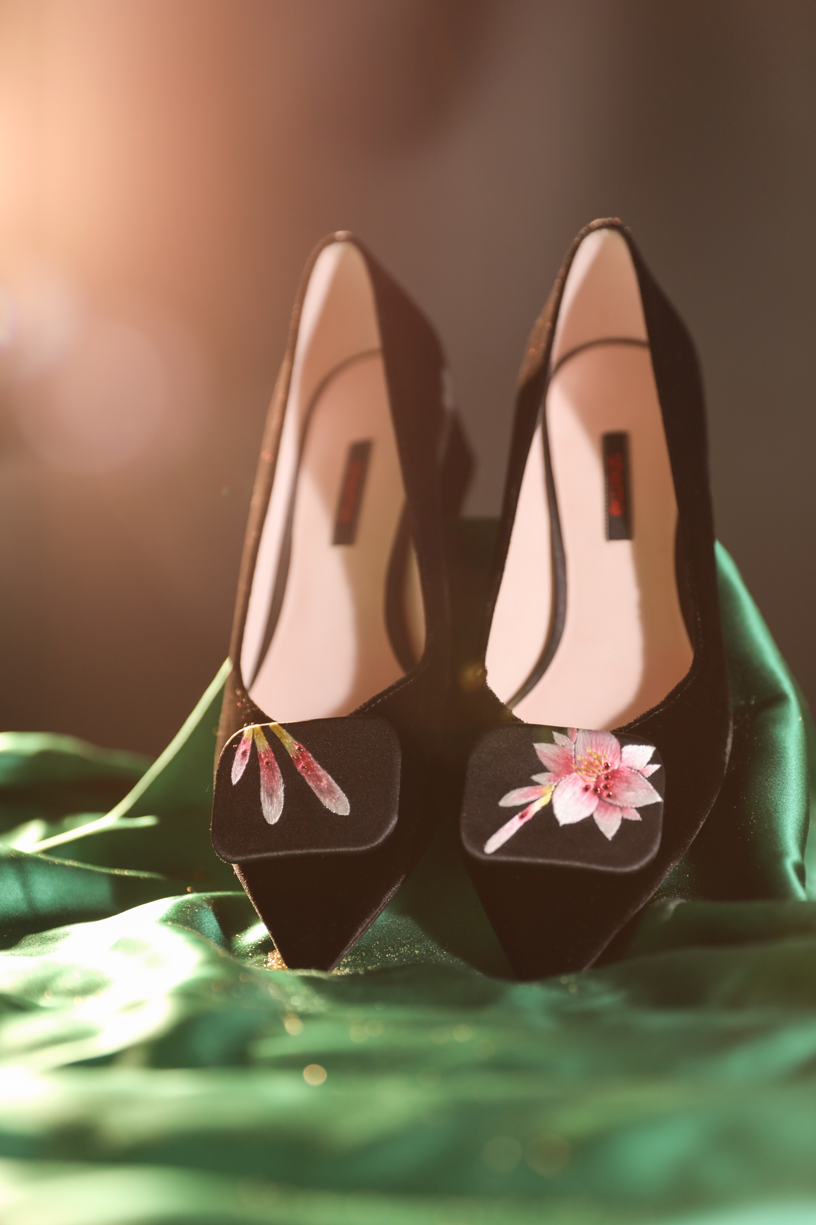 产品介绍:进口天鹅绒搭配进口丝绸面料,鞋头装饰用桃红色的顶冰花刺绣呈现,优雅精致