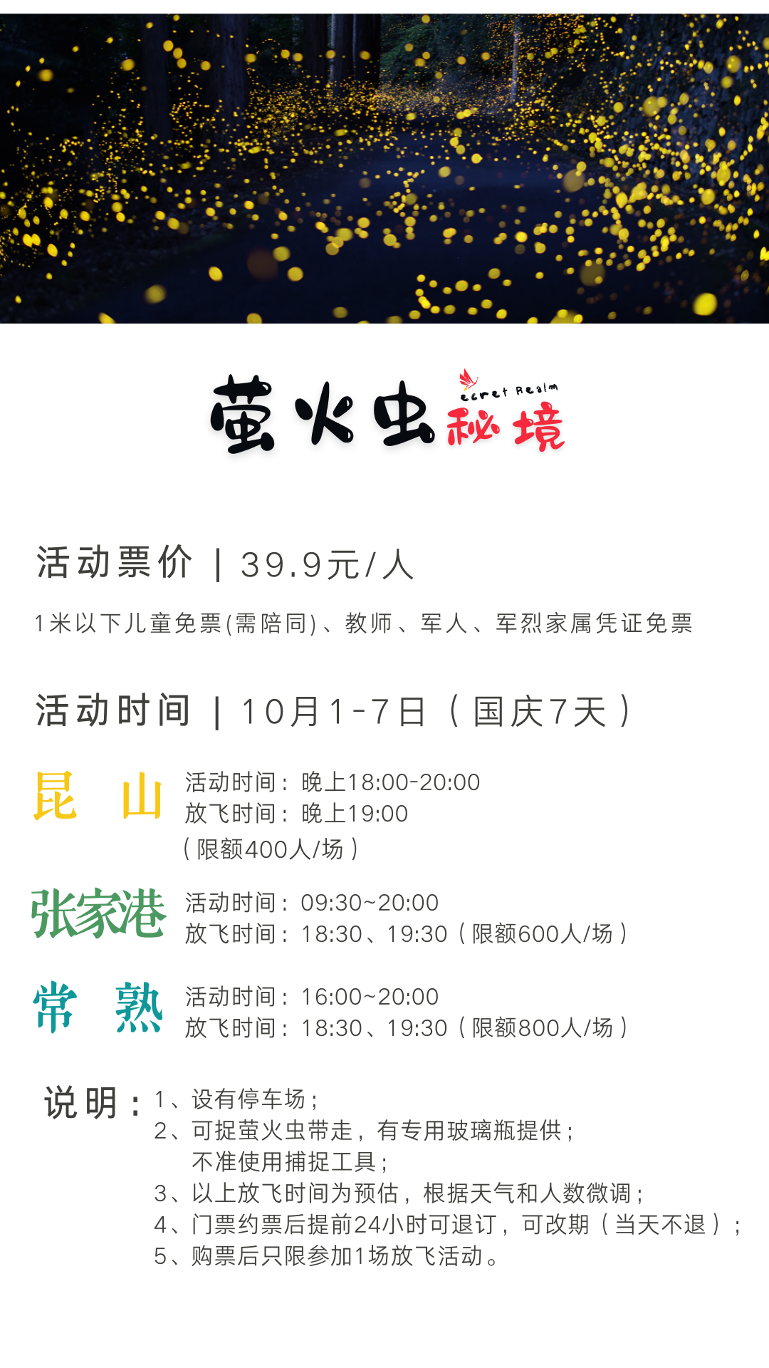 萤火虫秘境【10/1-7 通用票 无需预约】张家港、常熟 观赏放飞奇妙萤火虫、一起探秘萤火虫…