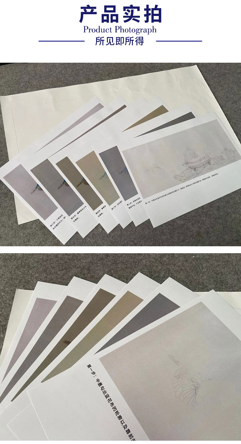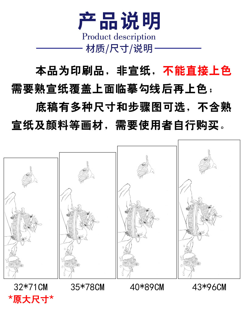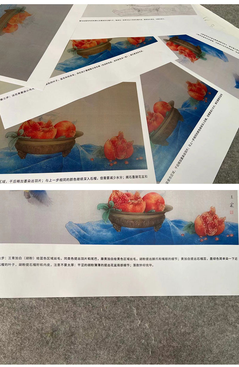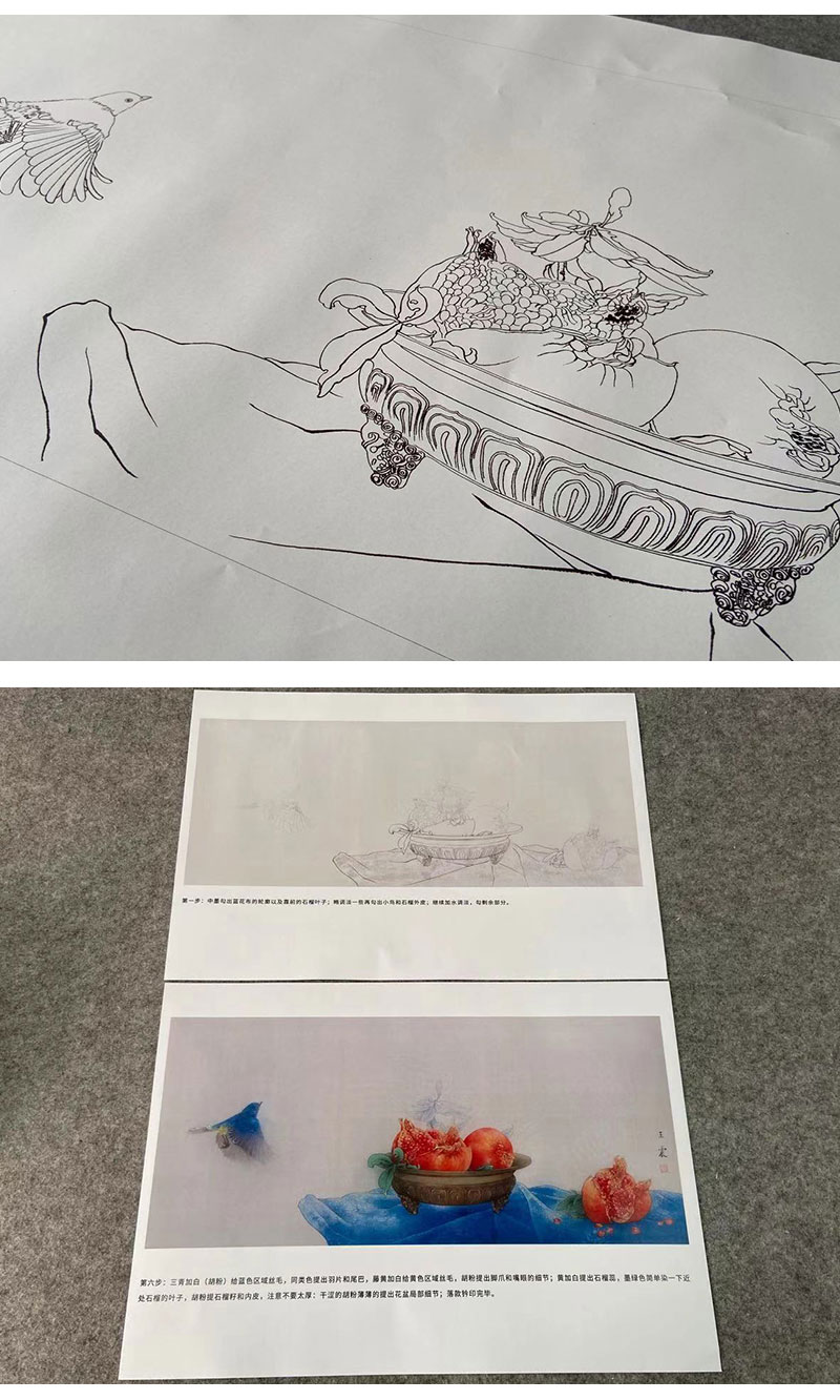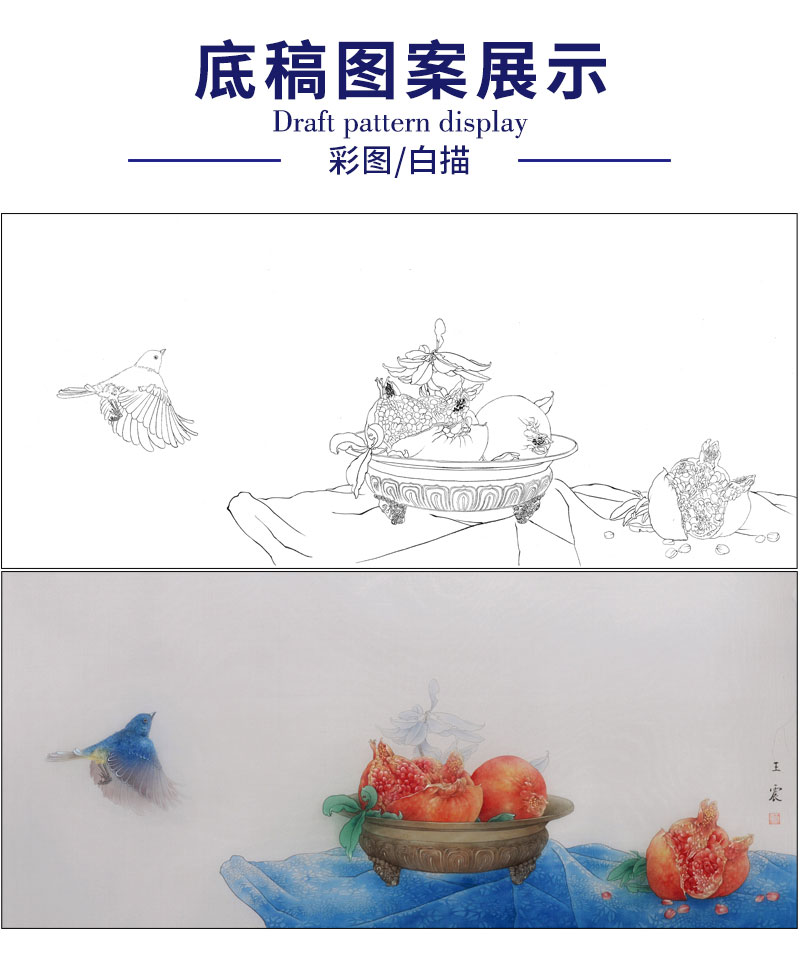 【有步骤】王震横幅工笔画白描底稿《蕊珠如火一时开》飞鸟石榴初学者临摹花鸟线稿WZ06
