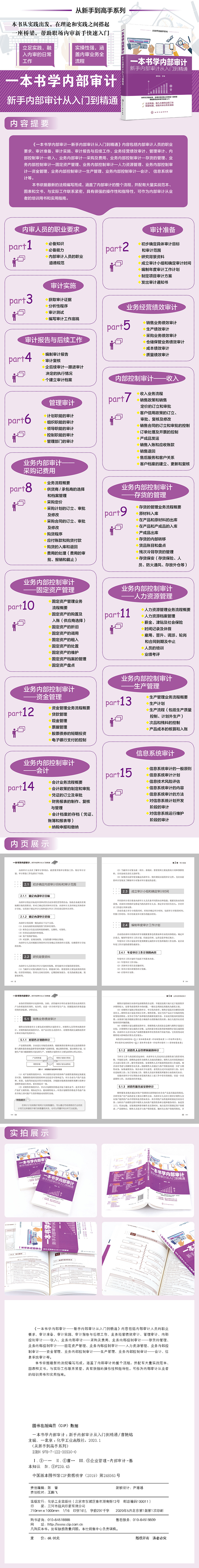 《一本书学内部审计——新手内部审计从入门到精通》一书涵盖15个章节,具体包括内审人员的职业要求、审计准备、审计实施、审计报告与后续工作、业务经营绩效审计、管理审计、内部控制审计——收入、业务内部审计——采购及费用、业务内部控制审计——存货的管理、业务内部控制审计——固定资产管理、业务内部控制审计——人力资源管理、业务内部控制审计——资金管理、业务内部控制审计——生产管理、业务内部控制审计——会计、 信息系统审计等内容。 本书实操性强,涵盖了内部审计的整个流程介绍,并配有大量实战范本、图表和文书,与实际工作联系紧密,具有很强的操作性;指导性强,本书依据新的法规编写而成,可作为内部审计从业者的培训用书和实用指南。