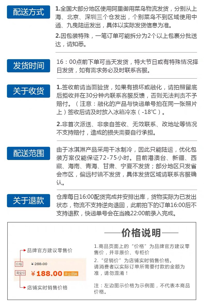 2 非首次派送、非亲自签收、无效联系、转寄、改签,无理由拒收、地址错误,电话错误,不接电话,中途更改地址(电话),放在快递柜(门卫等)不取件,导致冰淇淋融化的,一律不售后。