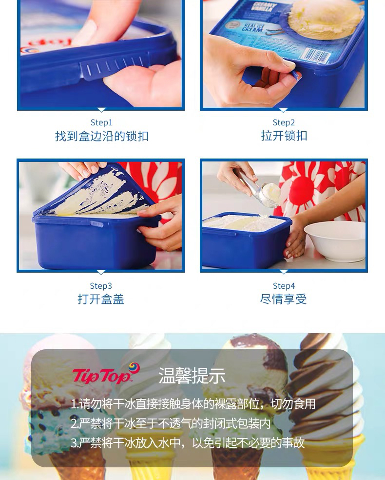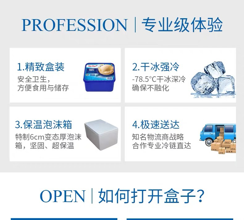 3 由于采用干冰深冷配送,包裹内的温度可能达到零下40度,因此在收到时冰淇淋会相对较硬,为获得最佳口感,请将冰淇淋放置在冰箱冷冻区2个小时,待表面松软后再食用。
