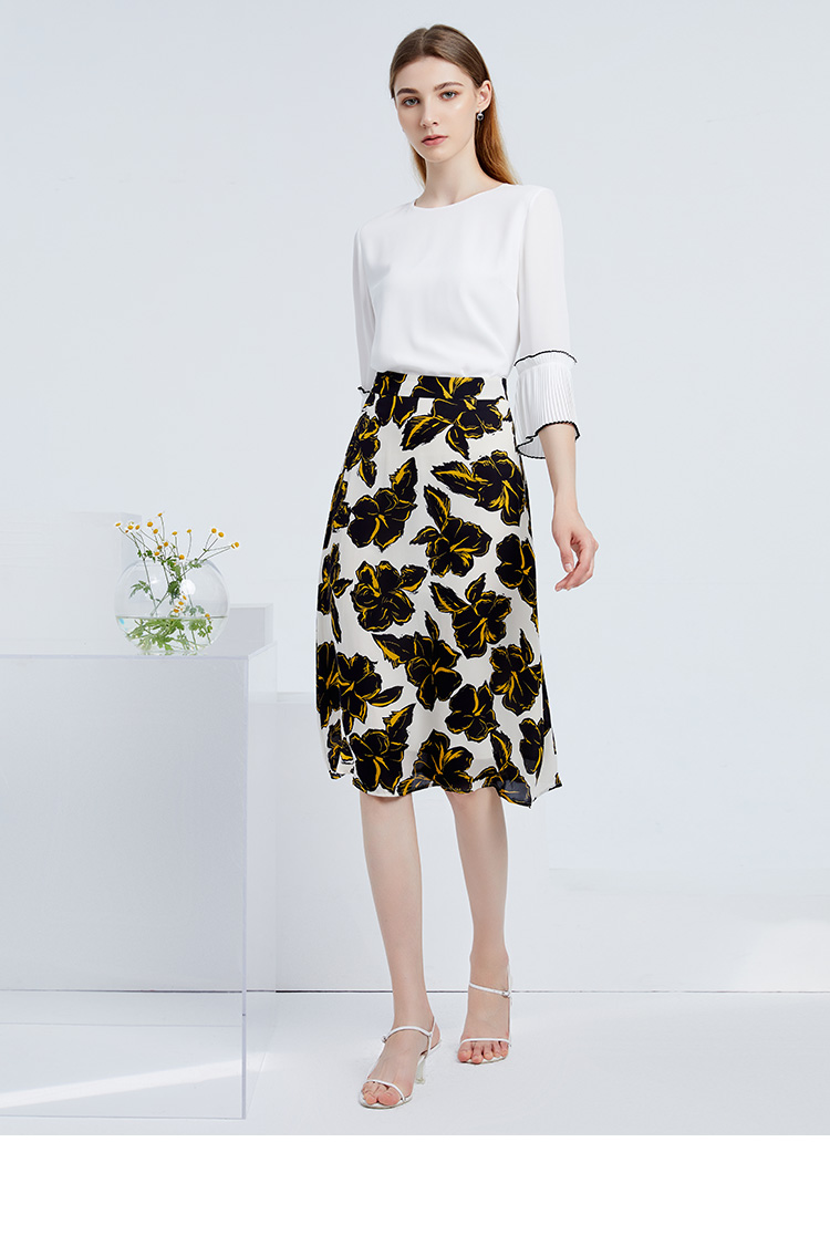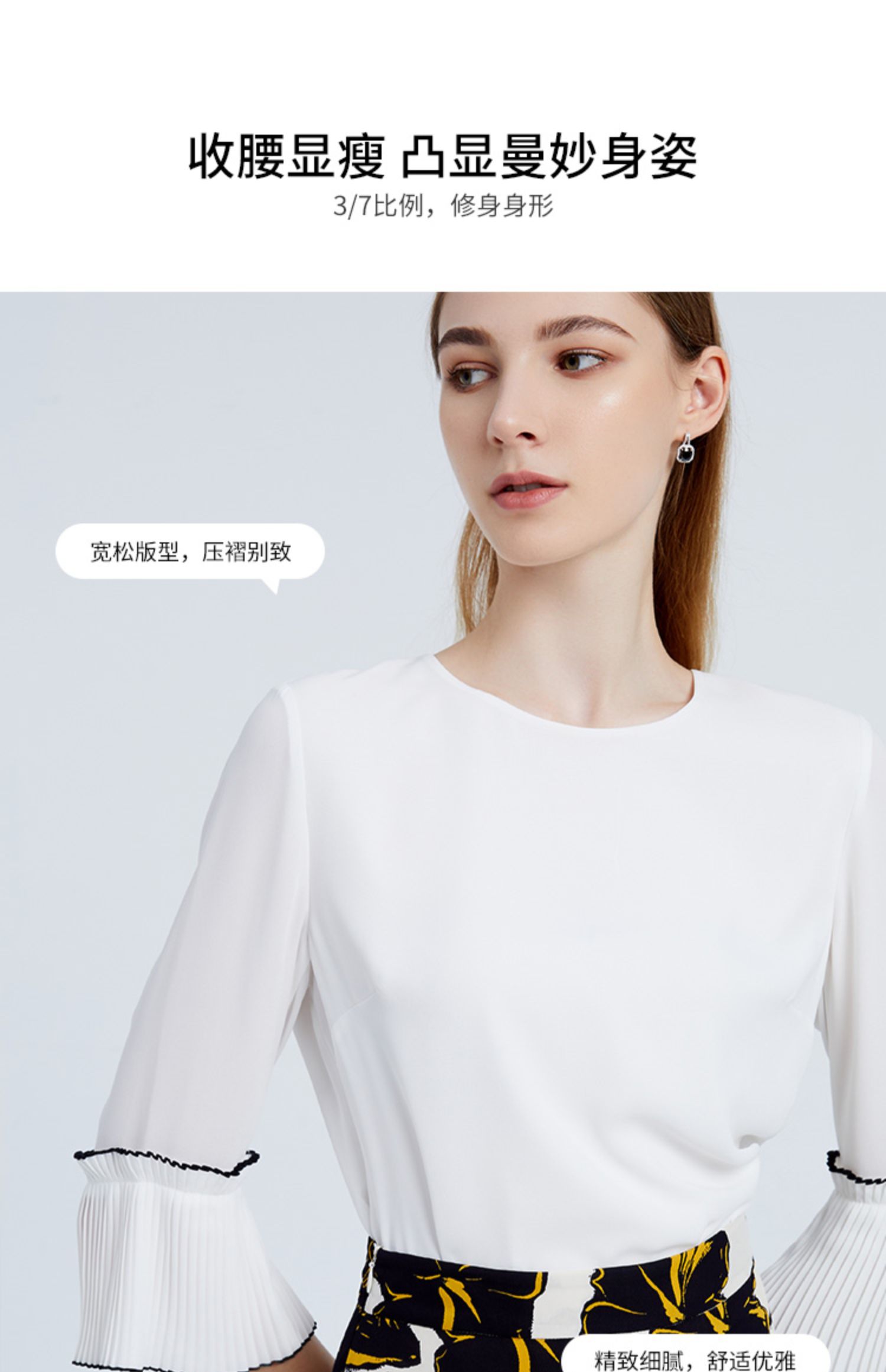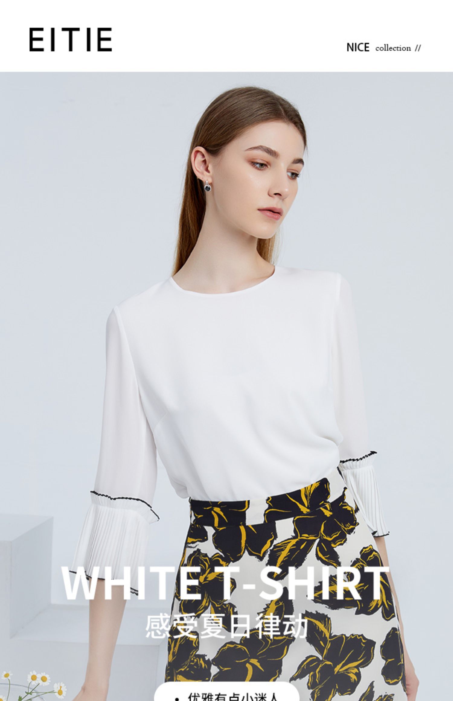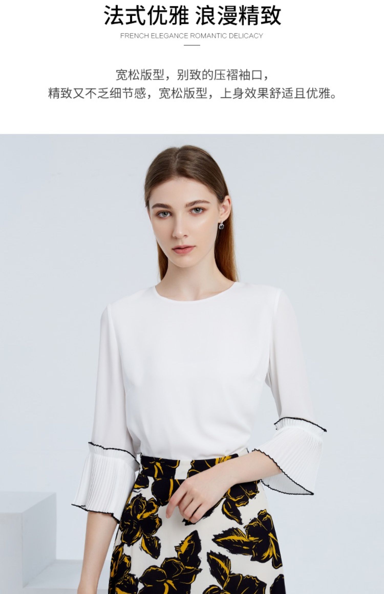 EITIE爱特爱秋季新款简约通勤喇叭袖直筒圆领套头T恤上衣6313003