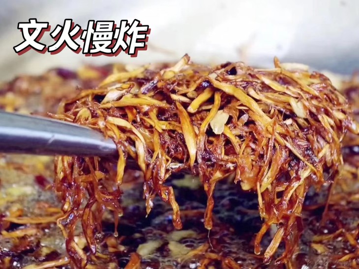 根据鸡枞状态调整烹饪时长,才能让成品的口味及干湿程度恰到好处。在几个小时的文火慢炸中,鸡枞的鲜香迁移到热油中,油香与菌香混为一体,热烈大气。
