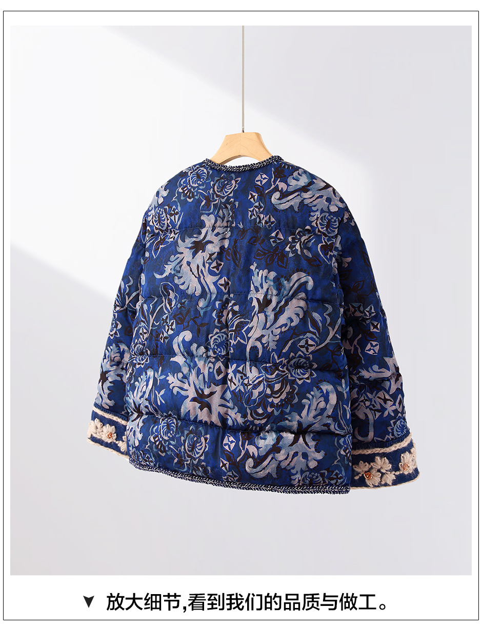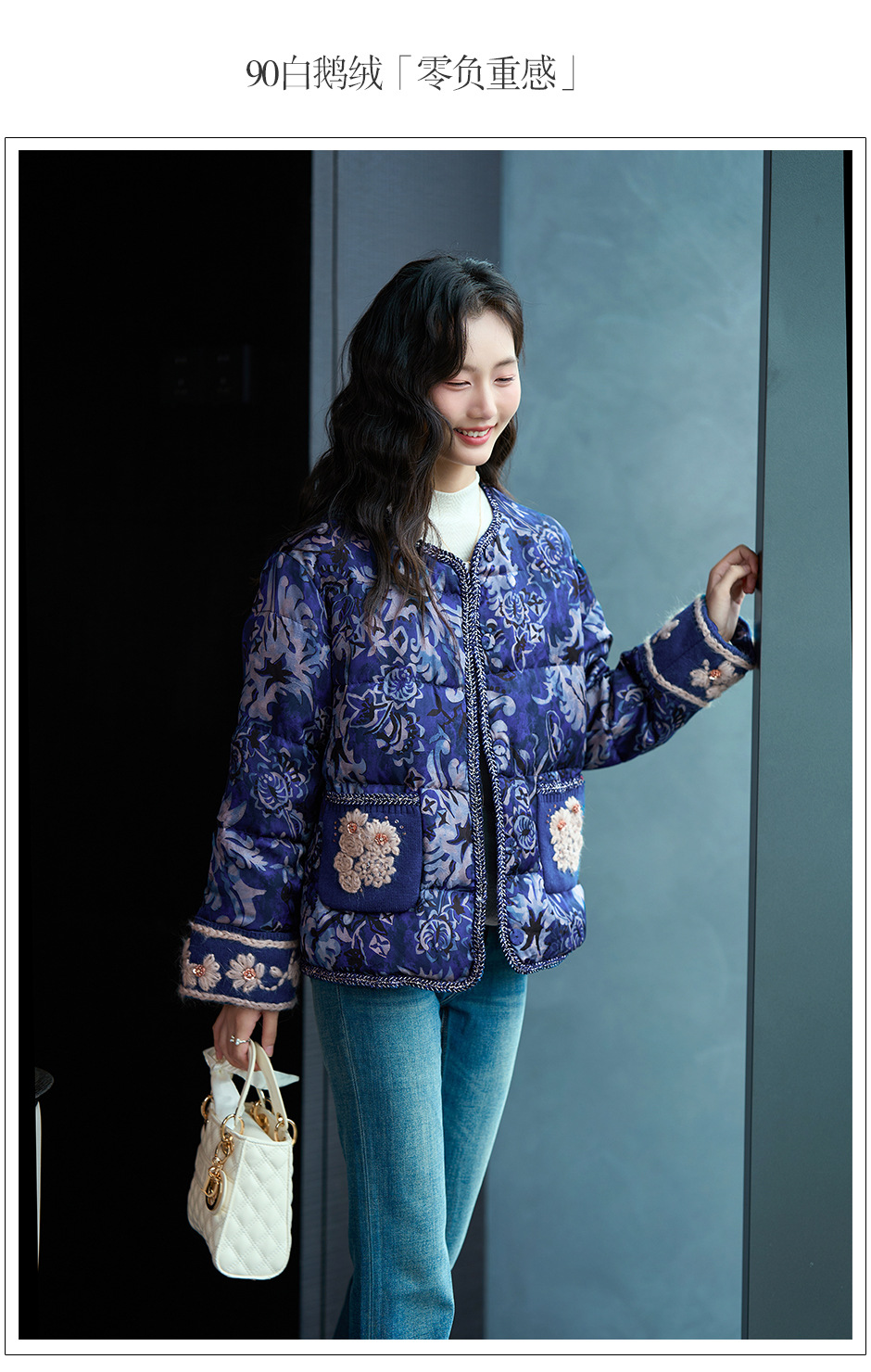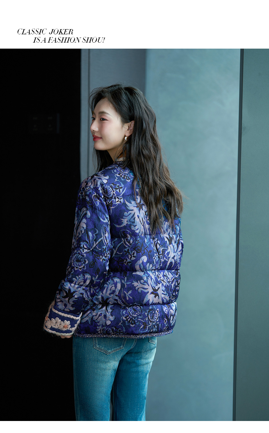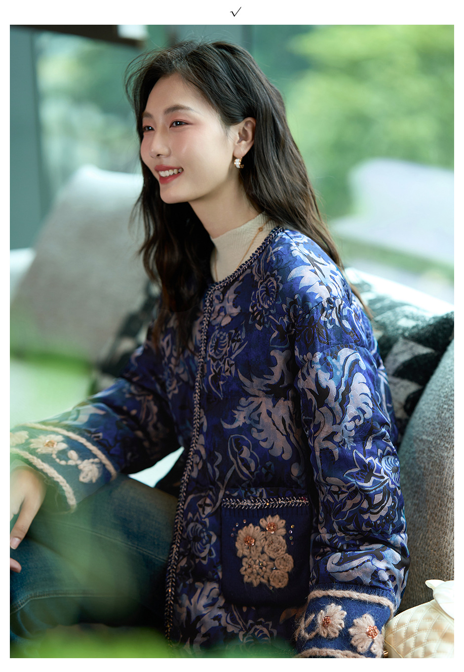 丁摩 复古青花瓷印花鹅绒羽绒服冬重工钉珠刺绣短款保暖外套5ZF-76071