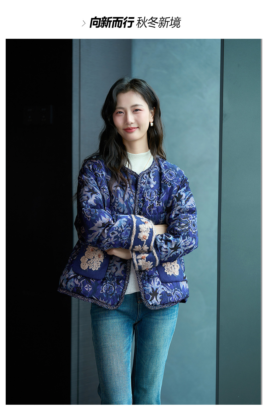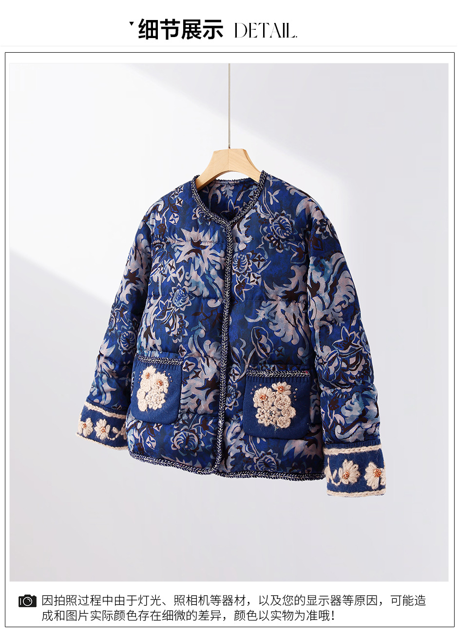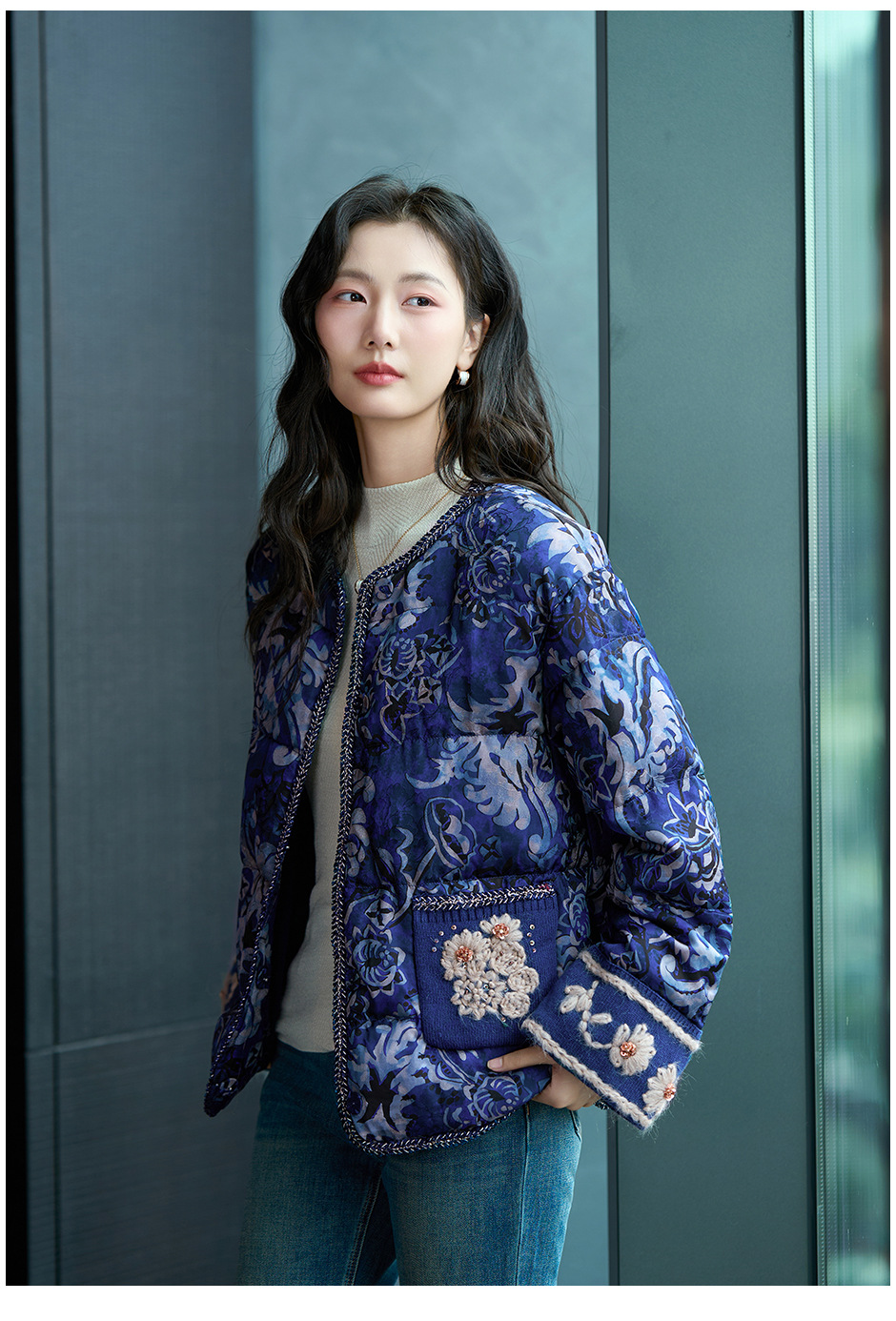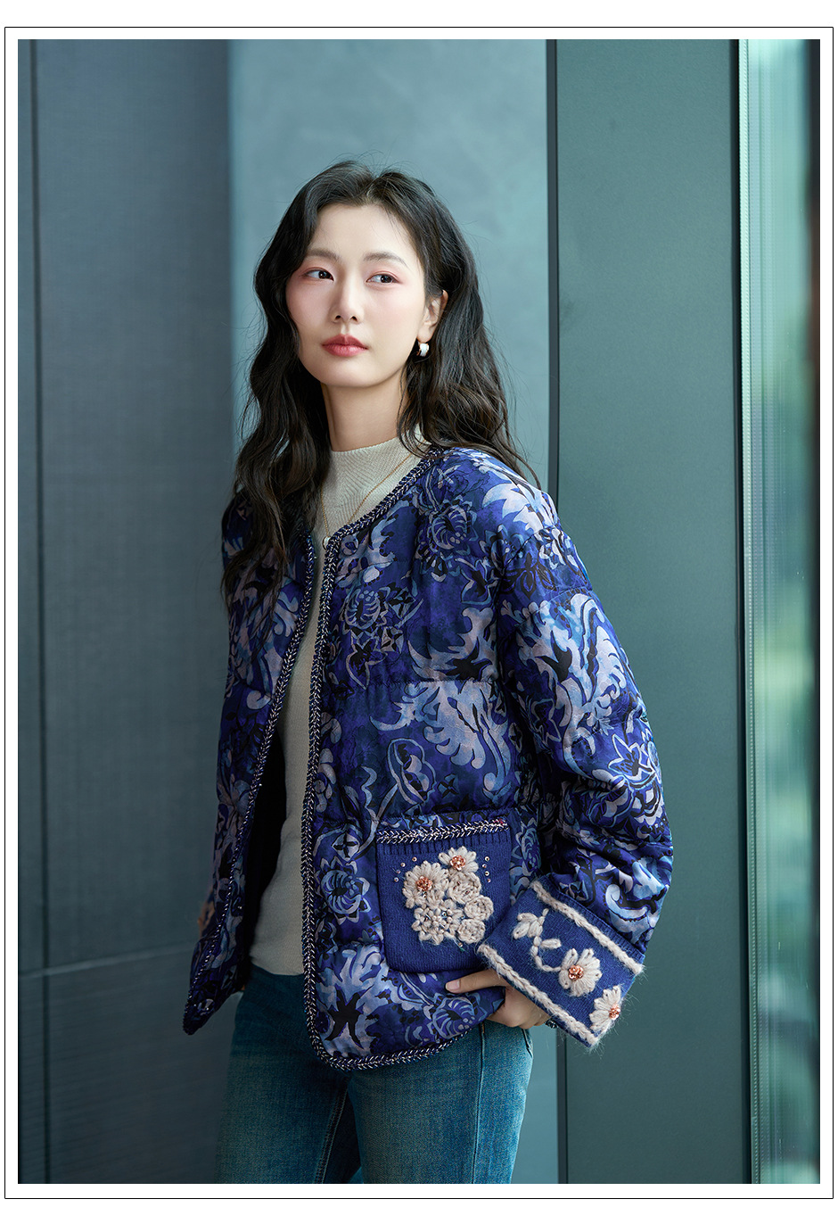 丁摩 复古青花瓷印花鹅绒羽绒服冬重工钉珠刺绣短款保暖外套5ZF-76071