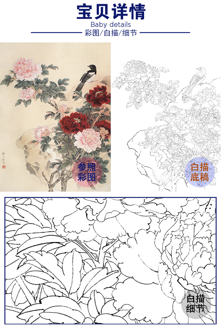 工笔花鸟白描底稿-龚文桢-牡丹喜鹊-斗方小品册页-A207