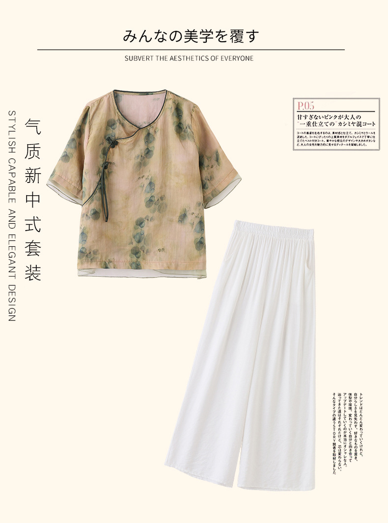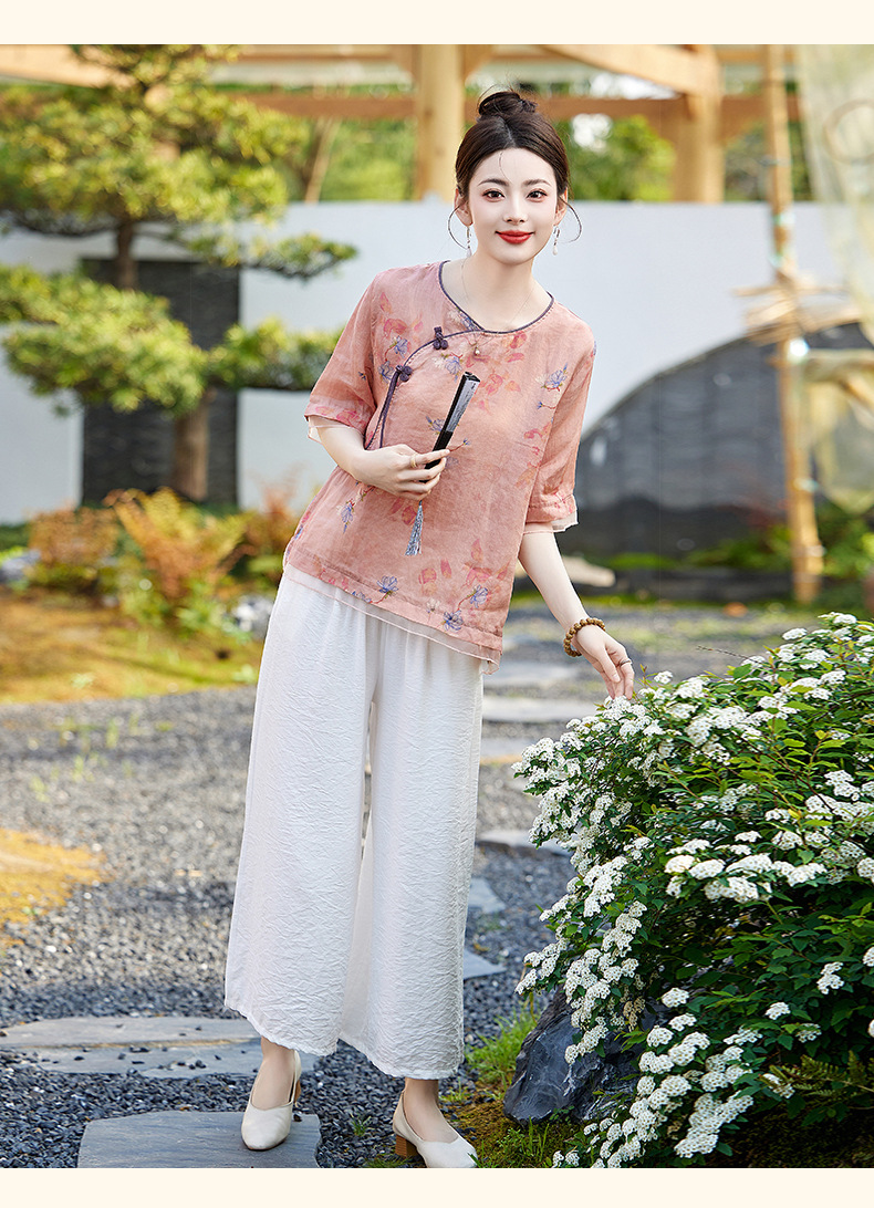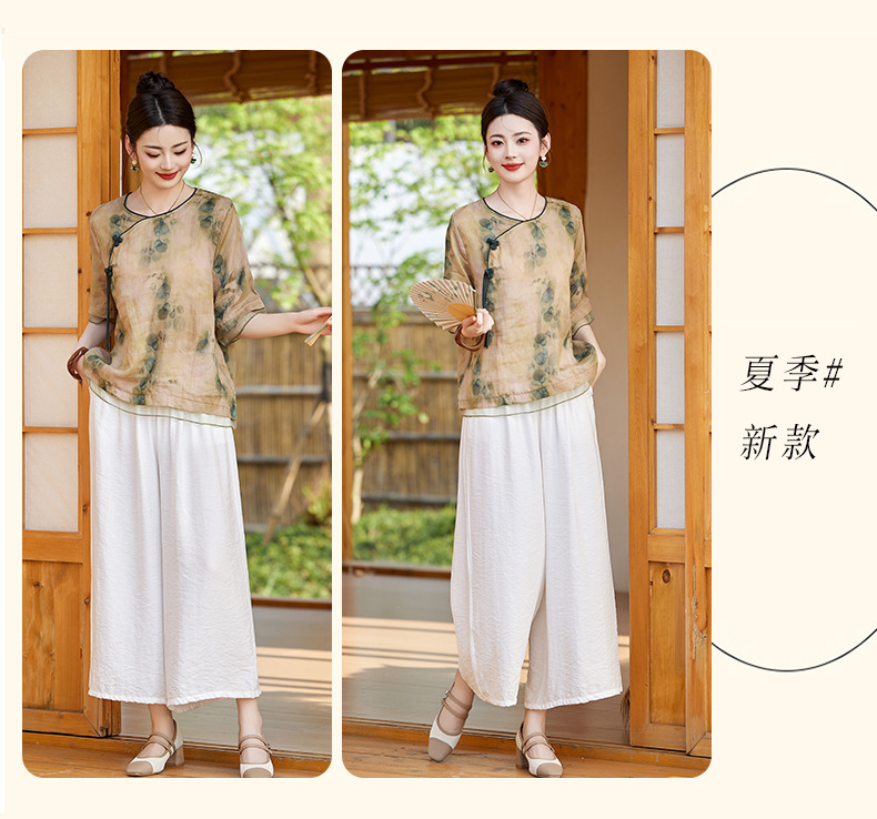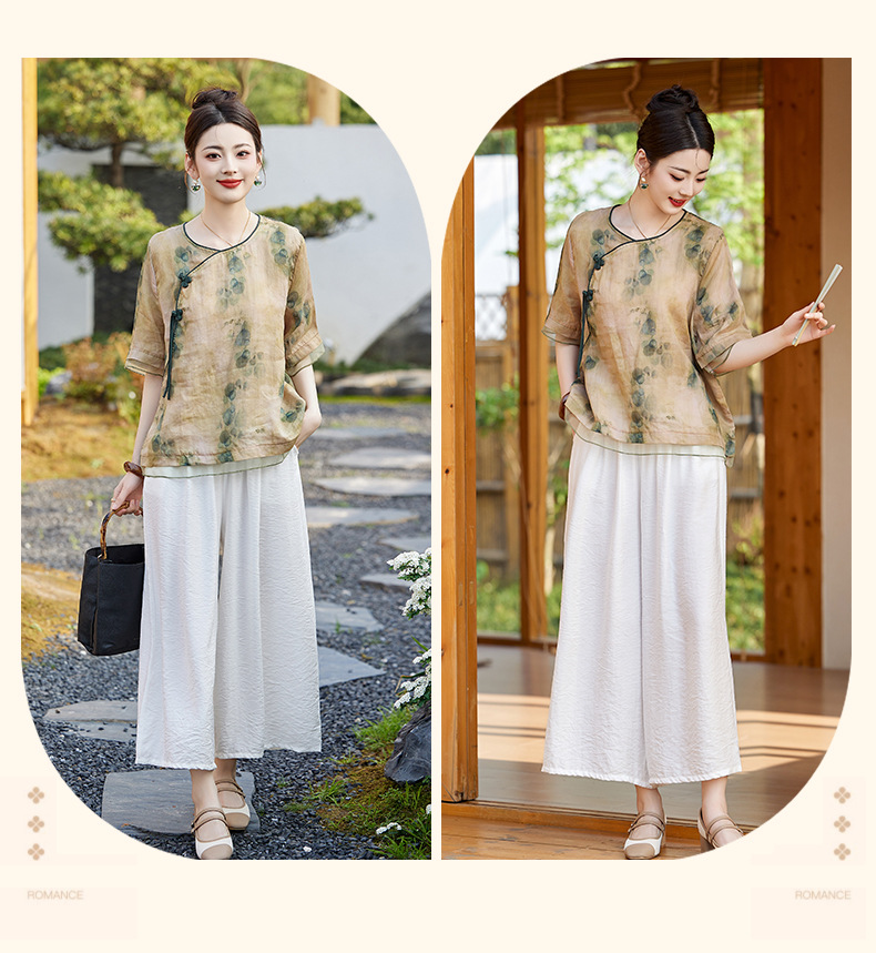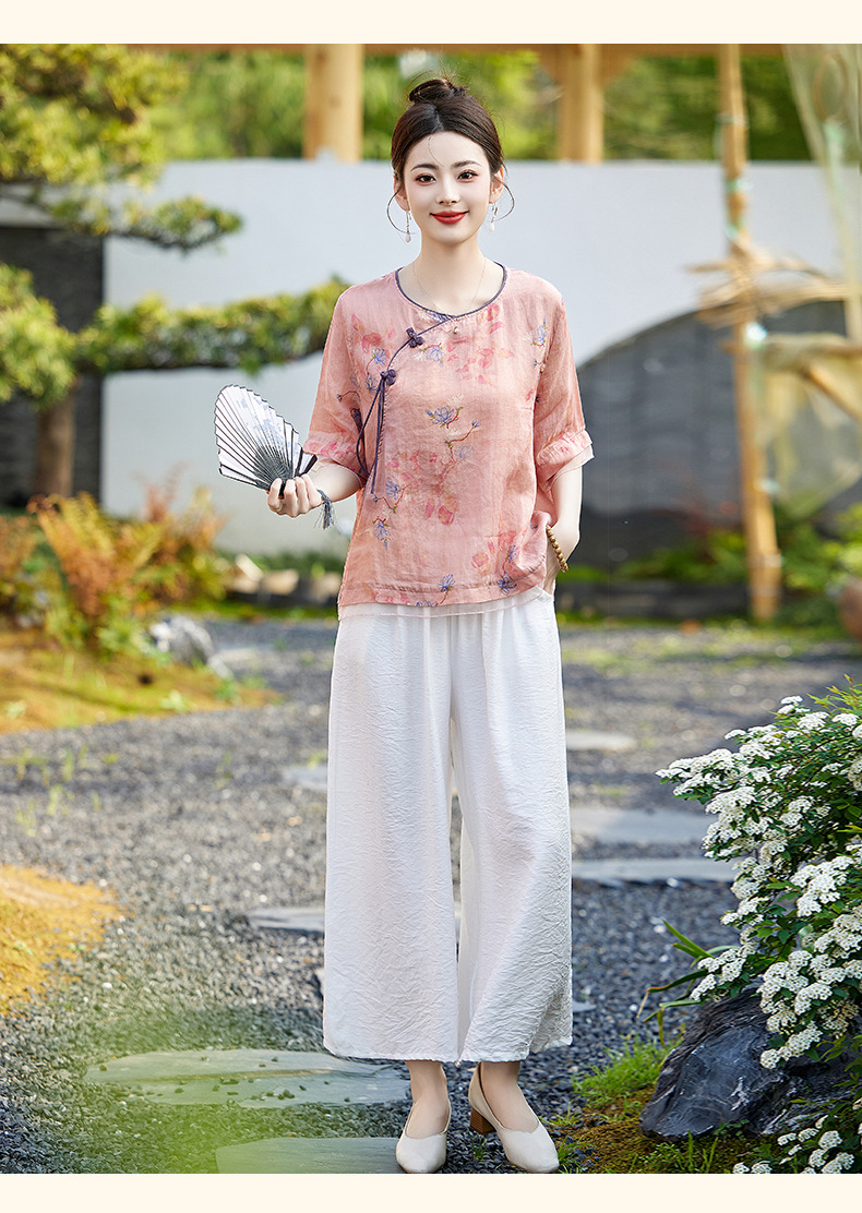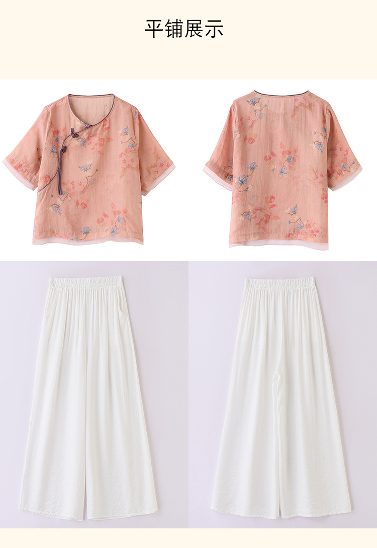 丁摩 高端碎花上衣苎麻【套装】亚麻女装夏季时尚两件套棉麻阔腿裤5ZF-86122