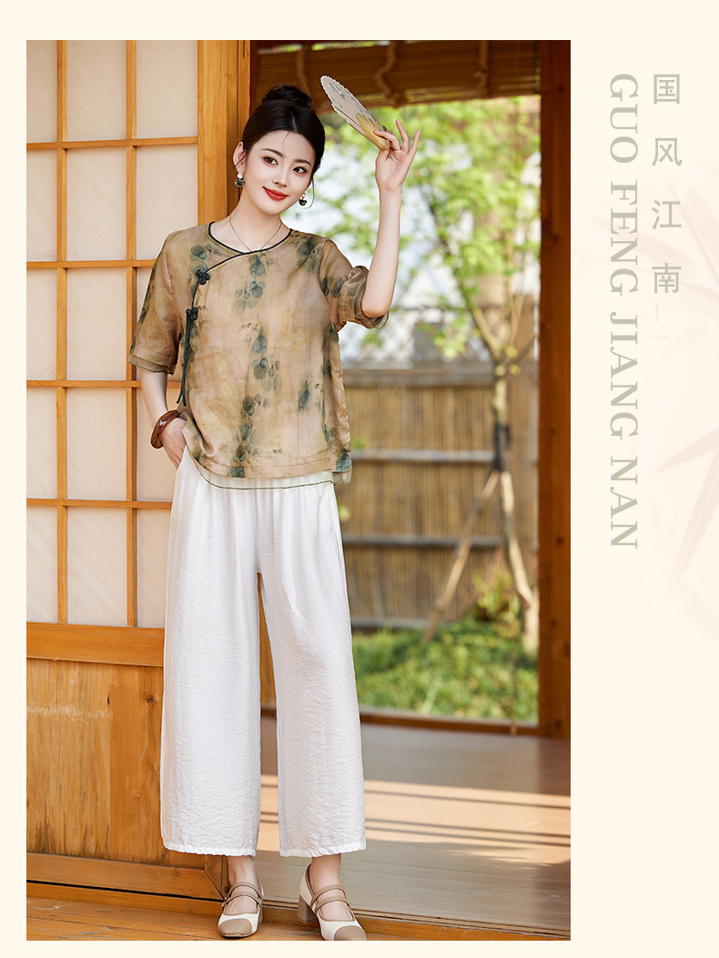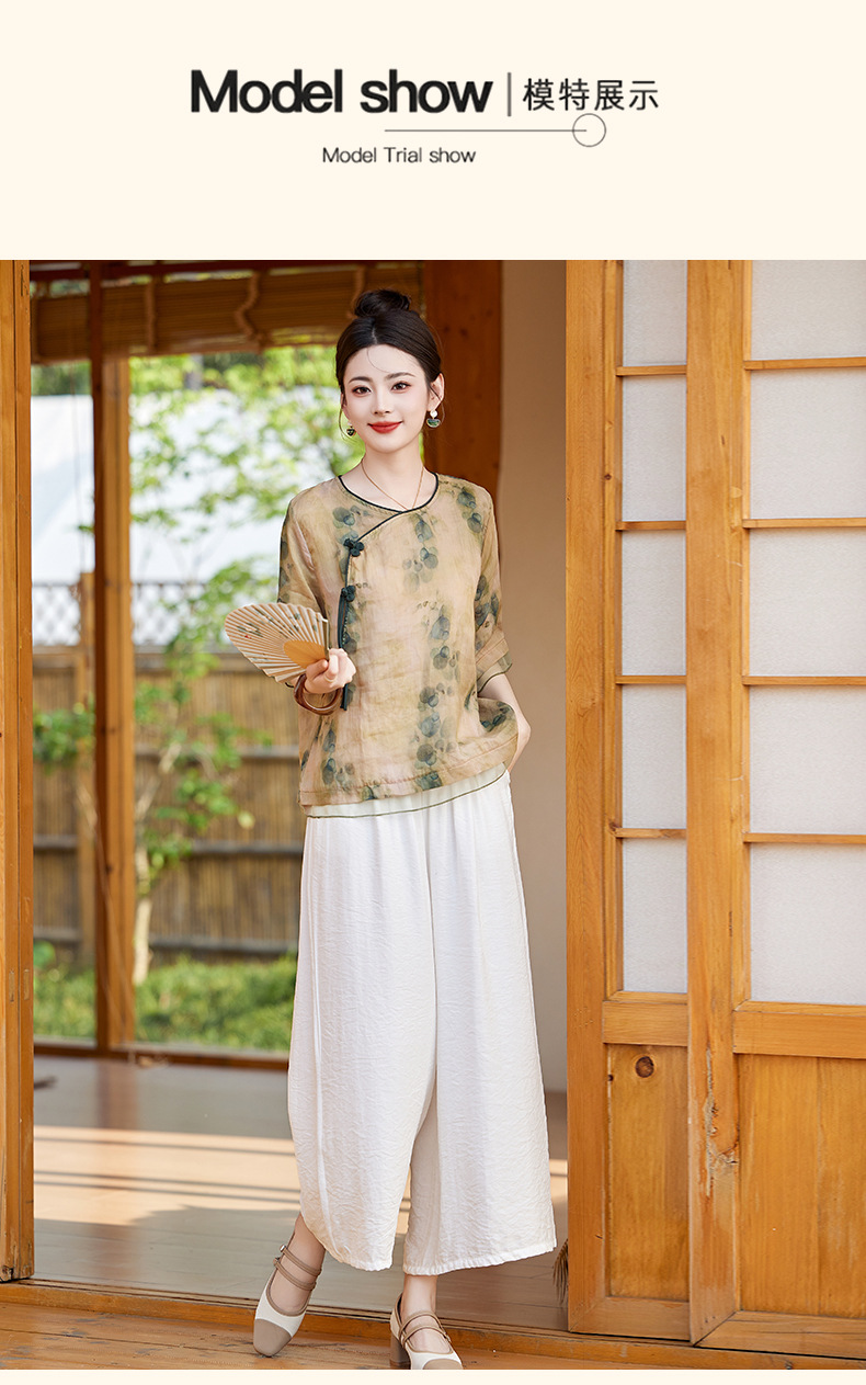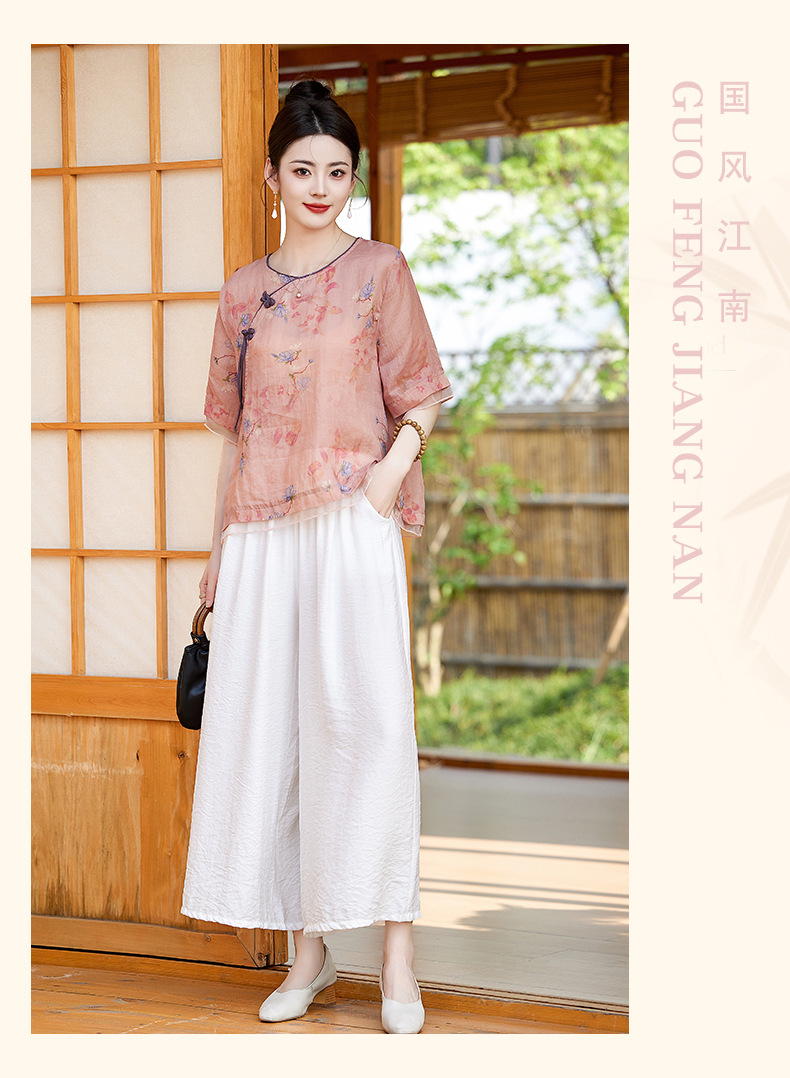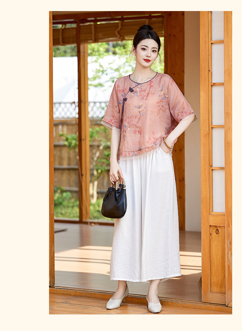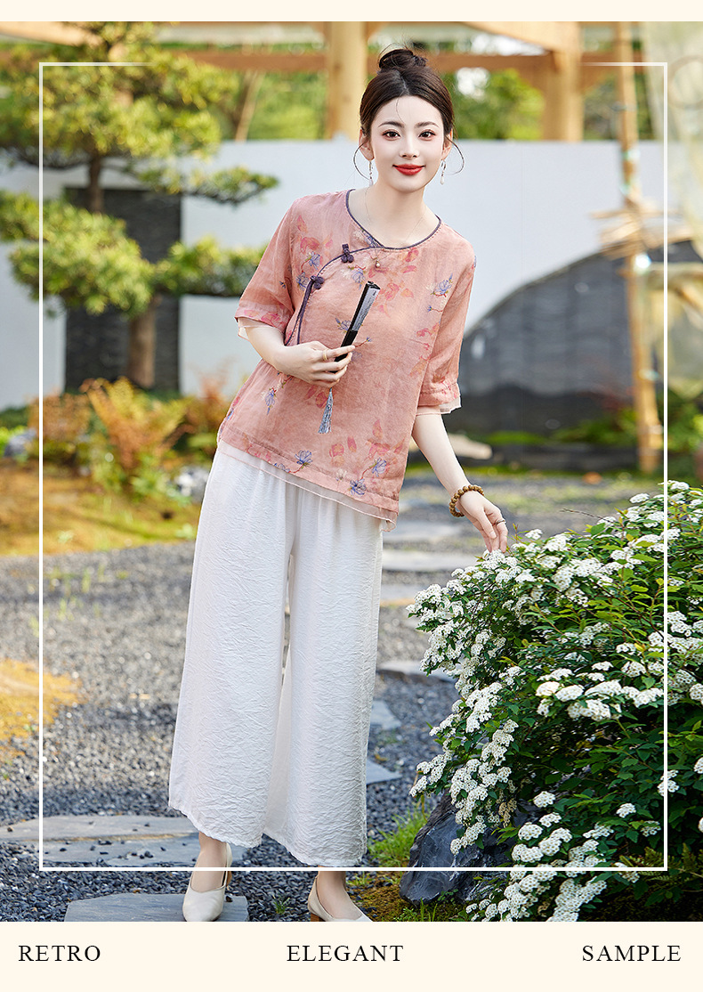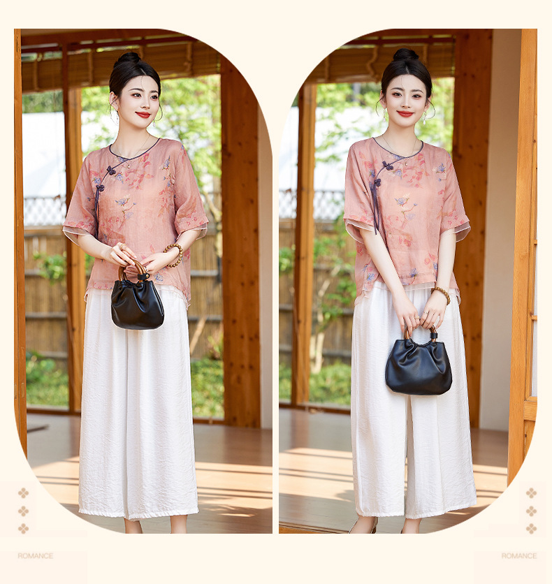 丁摩 高端碎花上衣苎麻【套装】亚麻女装夏季时尚两件套棉麻阔腿裤5ZF-86122